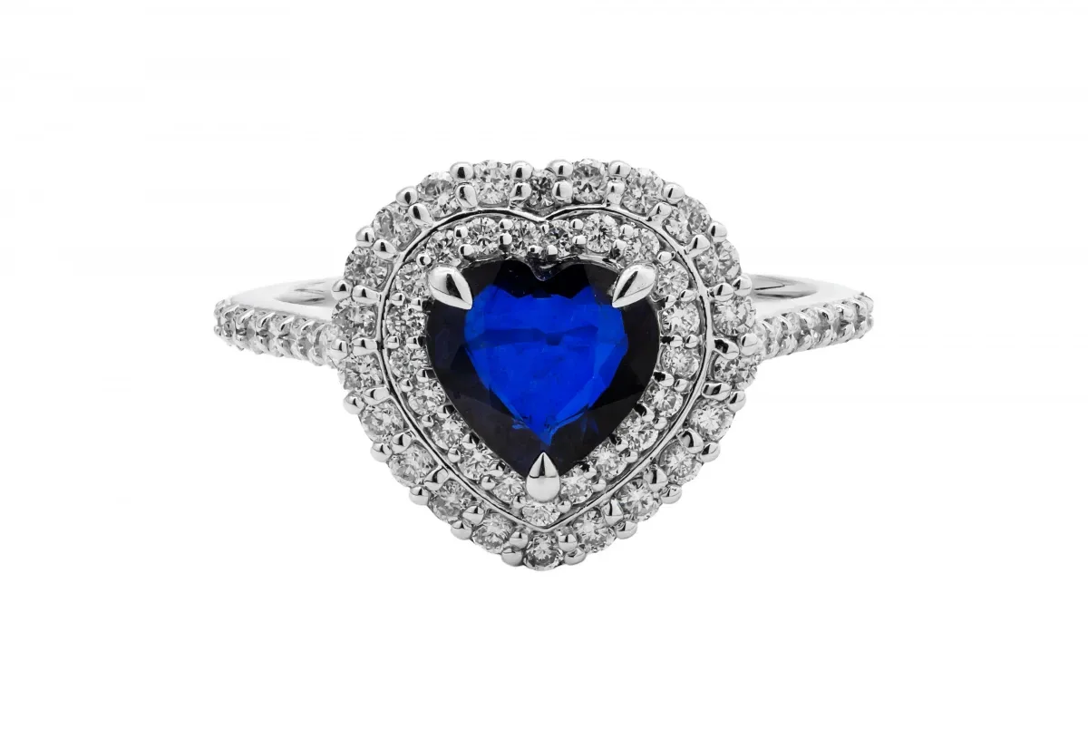 The heart-shaped sapphire weighs 0.98ct, and the diamonds add an additional 0.56ct of brilliance.