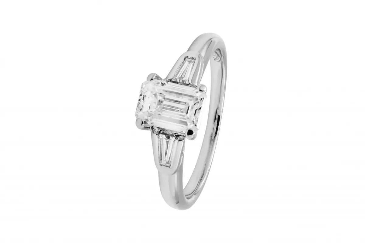 Certified by IGI, the centrepiece features an emerald cut diamond of D colour and VS2 clarity, flanked by two complementary stones for added brilliance. Weighs 3.7g, measures 1.9mm, and is a size M.