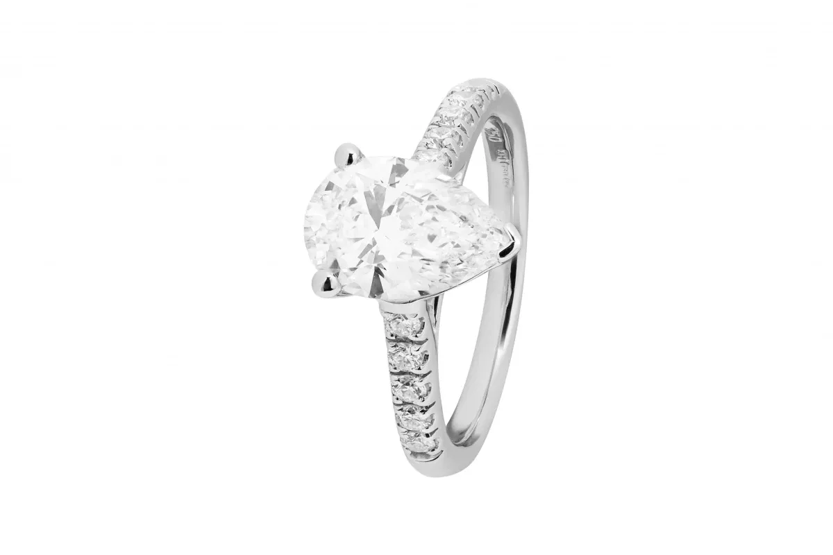 This 18ct White Gold Engagement Ring showcases a stunning 1.60ct lab-grown pear-shaped diamond, certified by IGI.