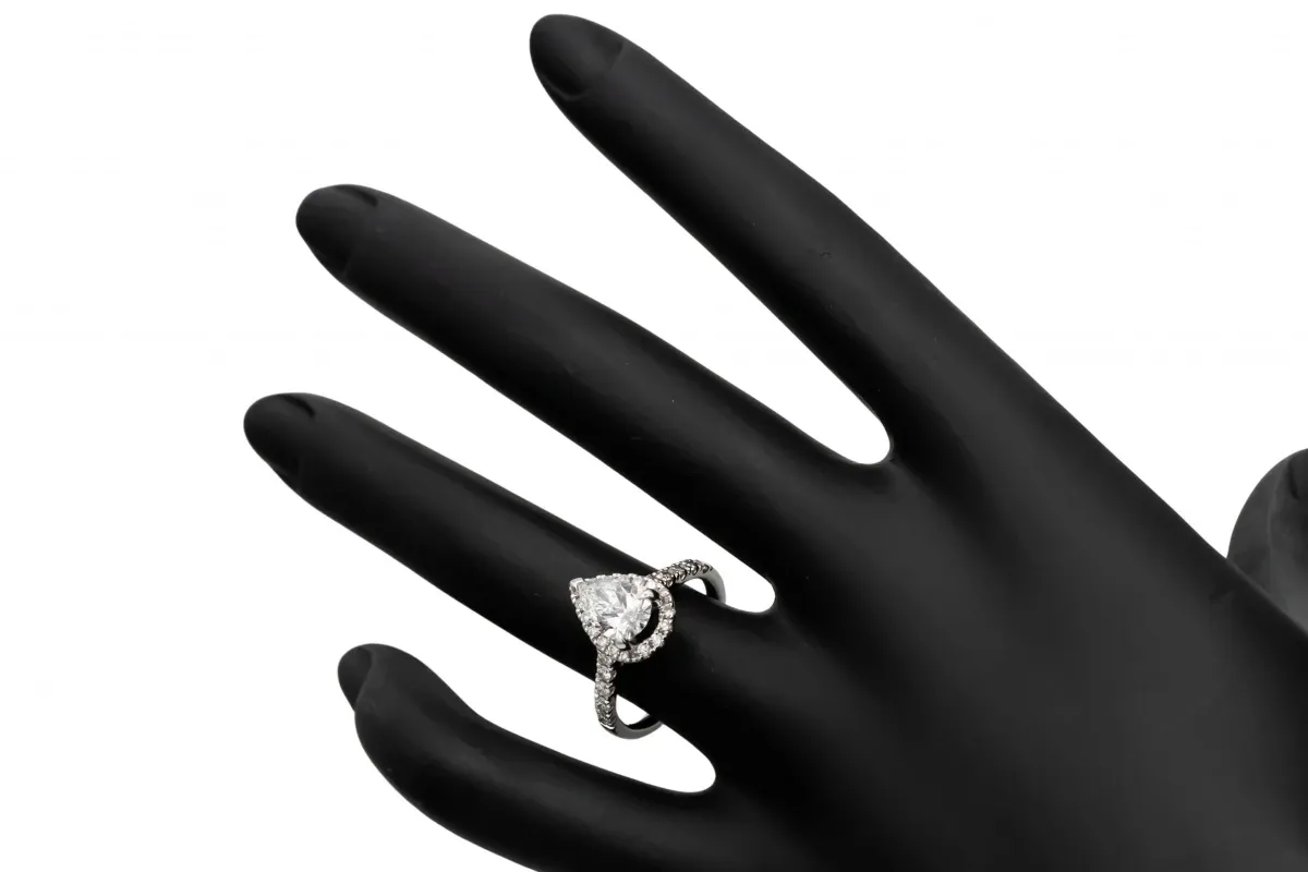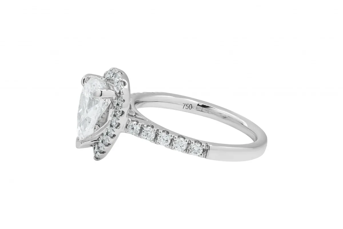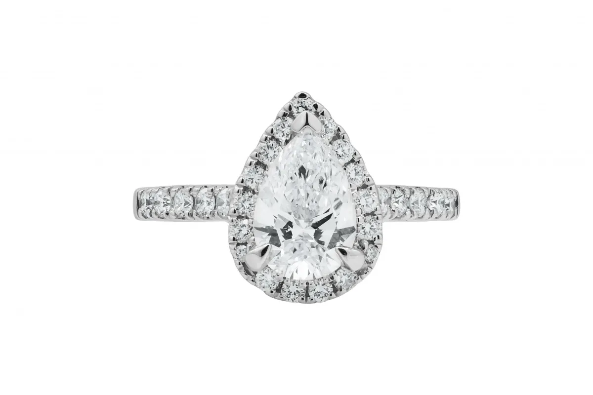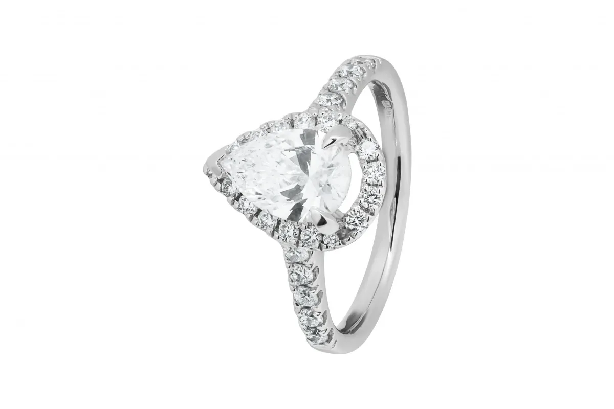 A romantic and timeless choice, this elegant engagement ring features a 0.15ct pear-shaped lab-grown diamond at its centre, surrounded by a sparkling 1.11ct diamond halo and mount, totalling 1.26ct.