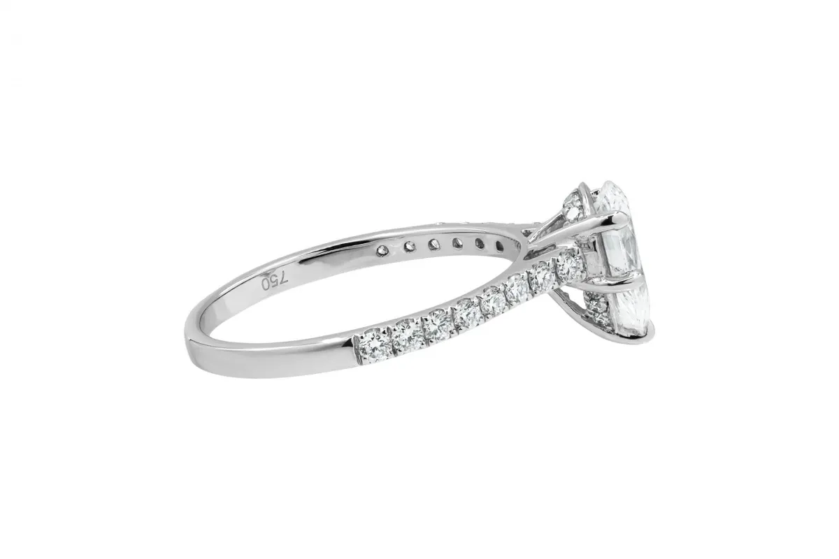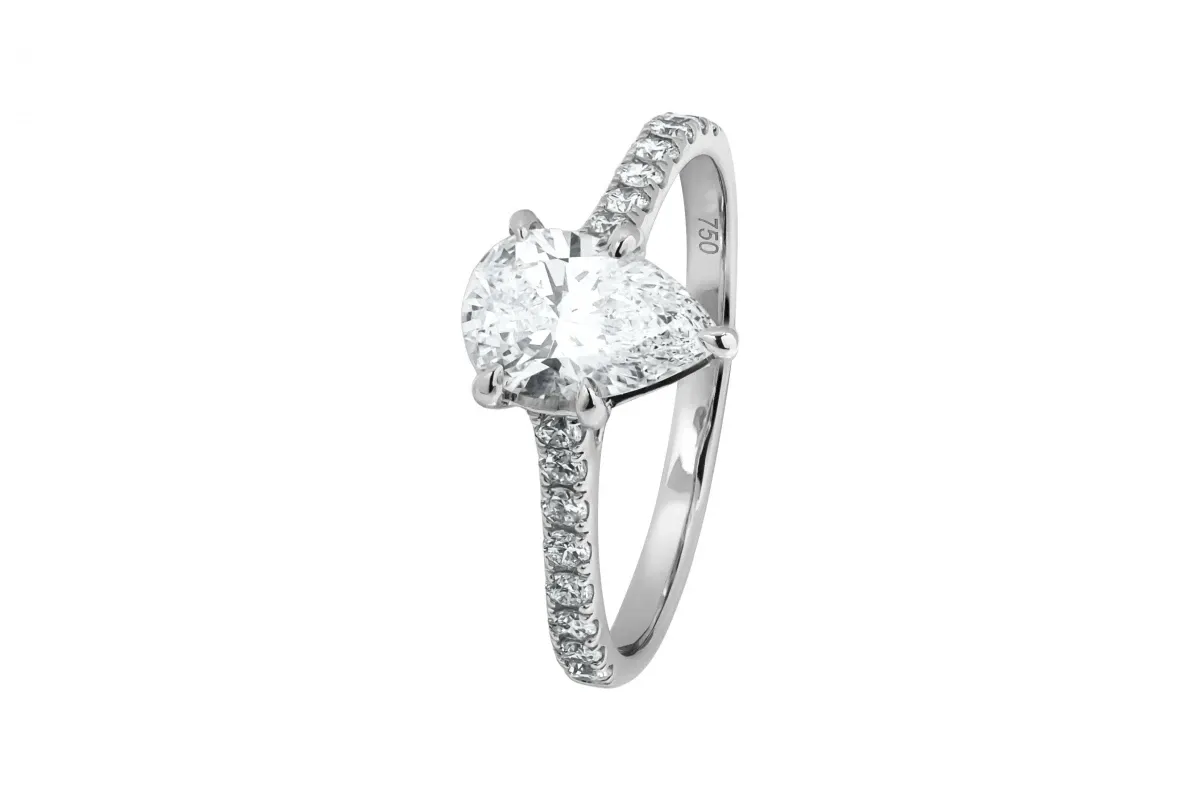 This elegant 18ct white gold engagement ring showcases a stunning 1.01ct pear-shaped lab-grown diamond as the centrepiece, enhanced by a delicate 0.15ct hidden halo mount for added sparkle.