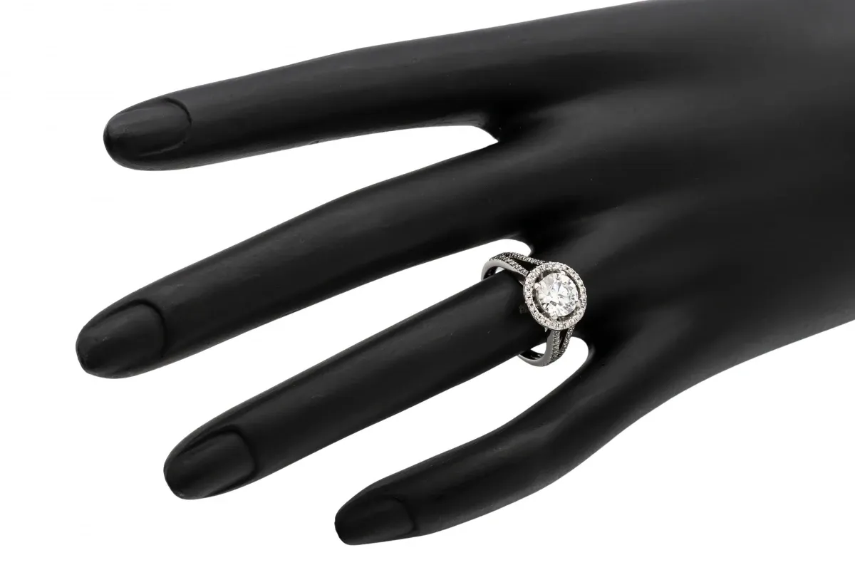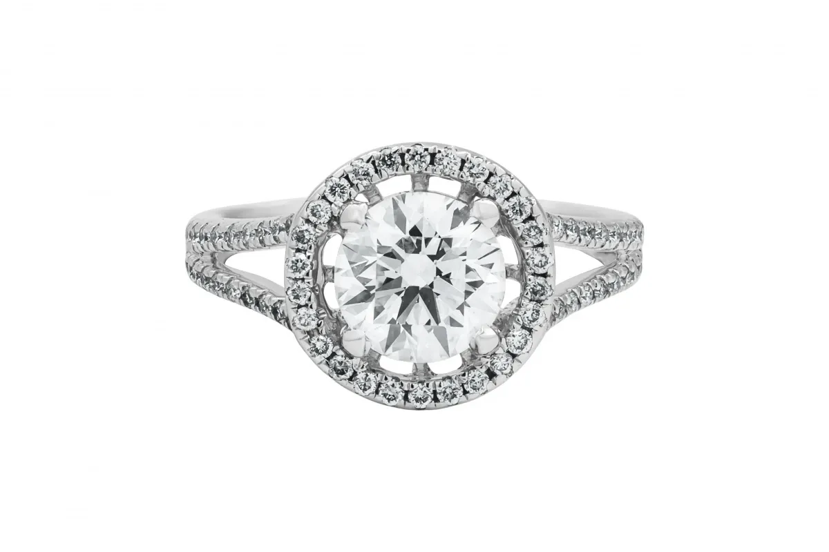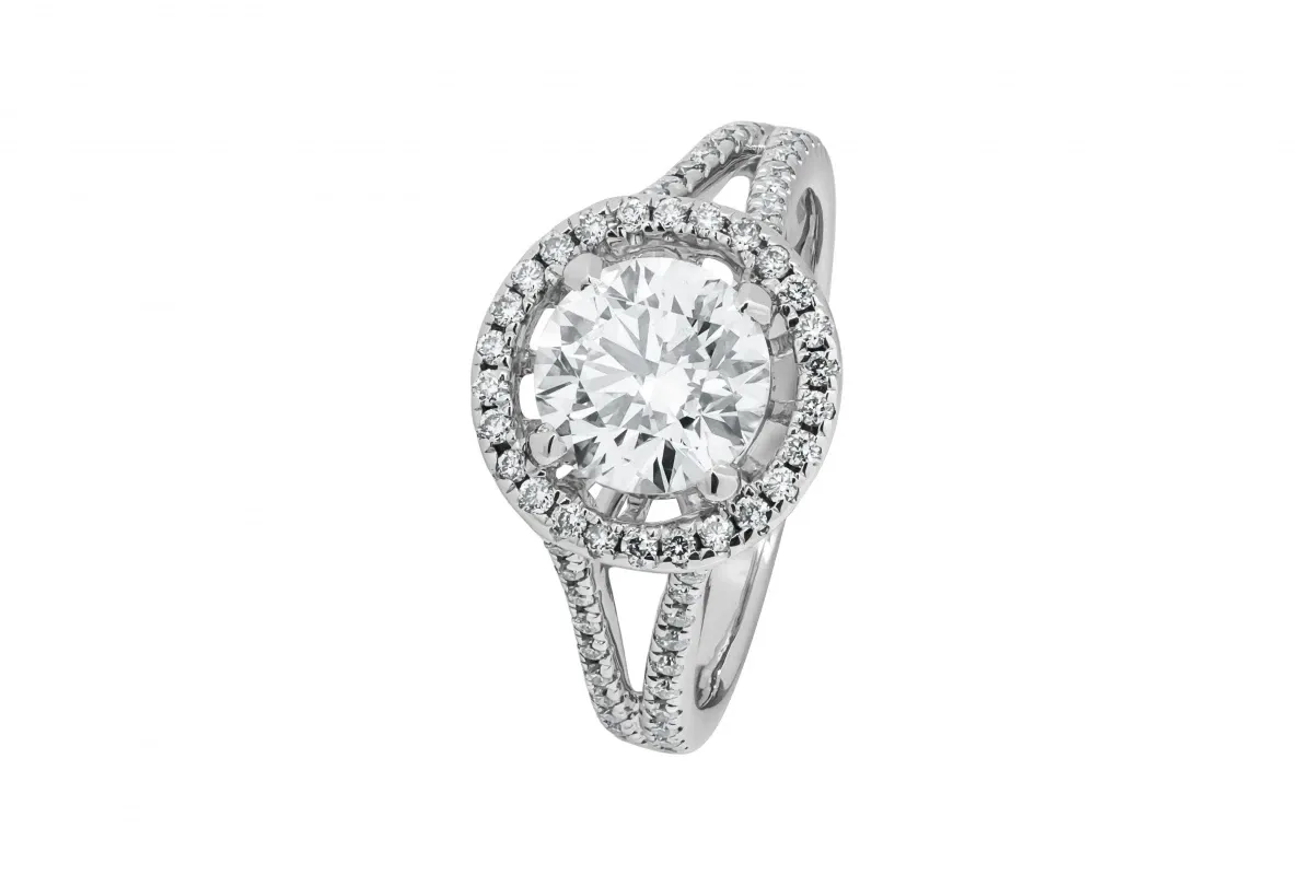 This elegant engagement ring showcases a 0.15ct round brilliant-cut lab diamond at its centre, encircled by a dazzling 1.33ct halo and mount, bringing the total carat weight to 1.48ct.