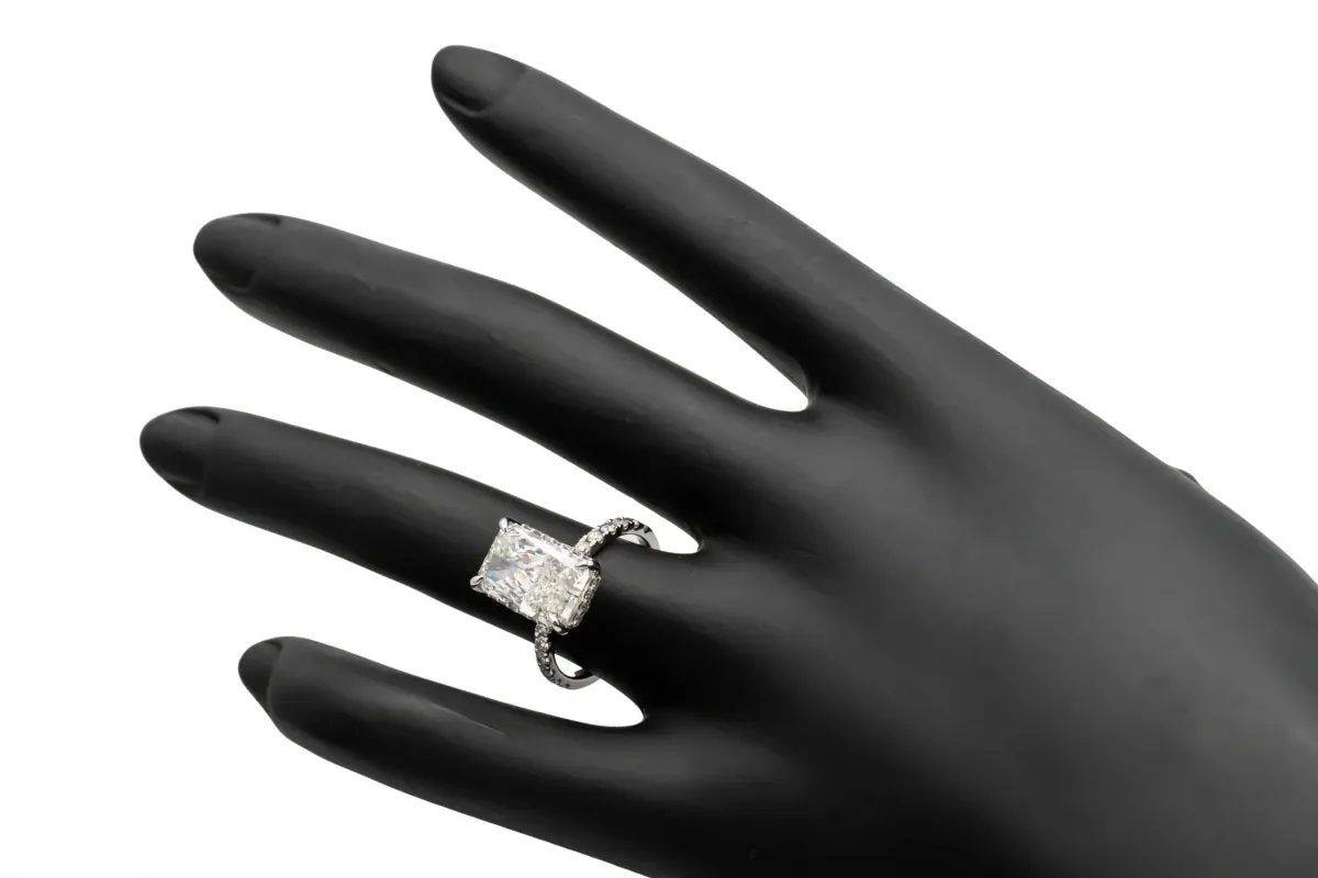 This stunning 18ct White Gold Lab Grown Diamond Engagement Ring features a 4ct radiant diamond with a hidden halo, offering exceptional brilliance and elegance.