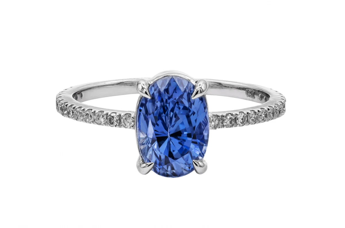 Crafted in 18ct white gold, this elegant ring features a deep blue oval sapphire that creates a striking centrepiece. Diamond-set shoulders add further brilliance, enhancing the vivid colour of the sapphire and creating a timeless and sophisticated design.