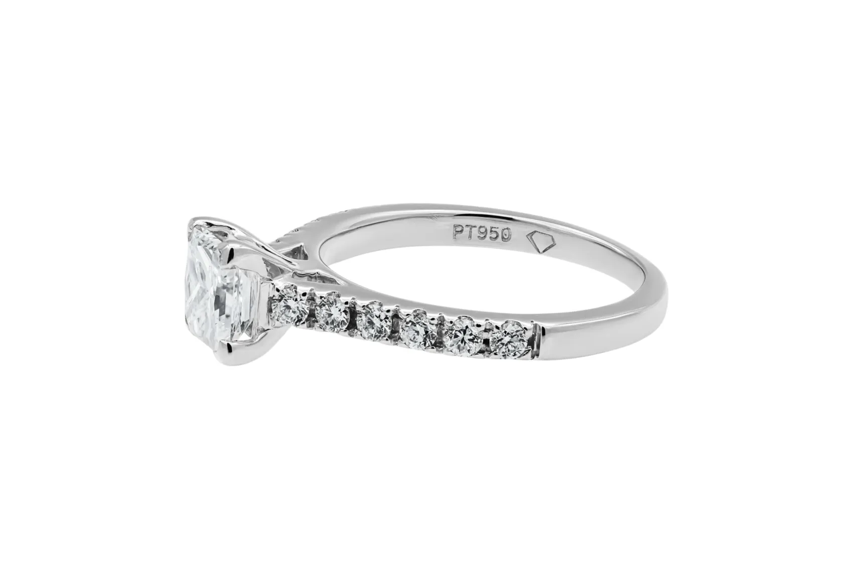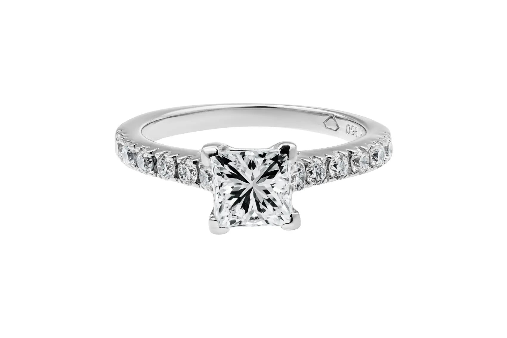This refined platinum engagement ring is set with a 1.04ct princess cut diamond, graded G colour with VS clarity for crisp brilliance and clean definition.