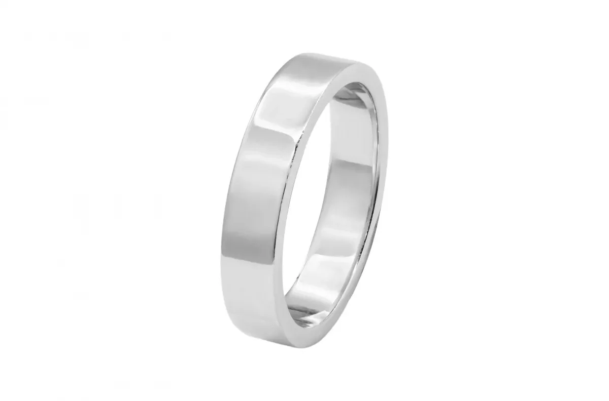 This solid 18ct white gold flat court wedding ring combines contemporary style with timeless elegance.