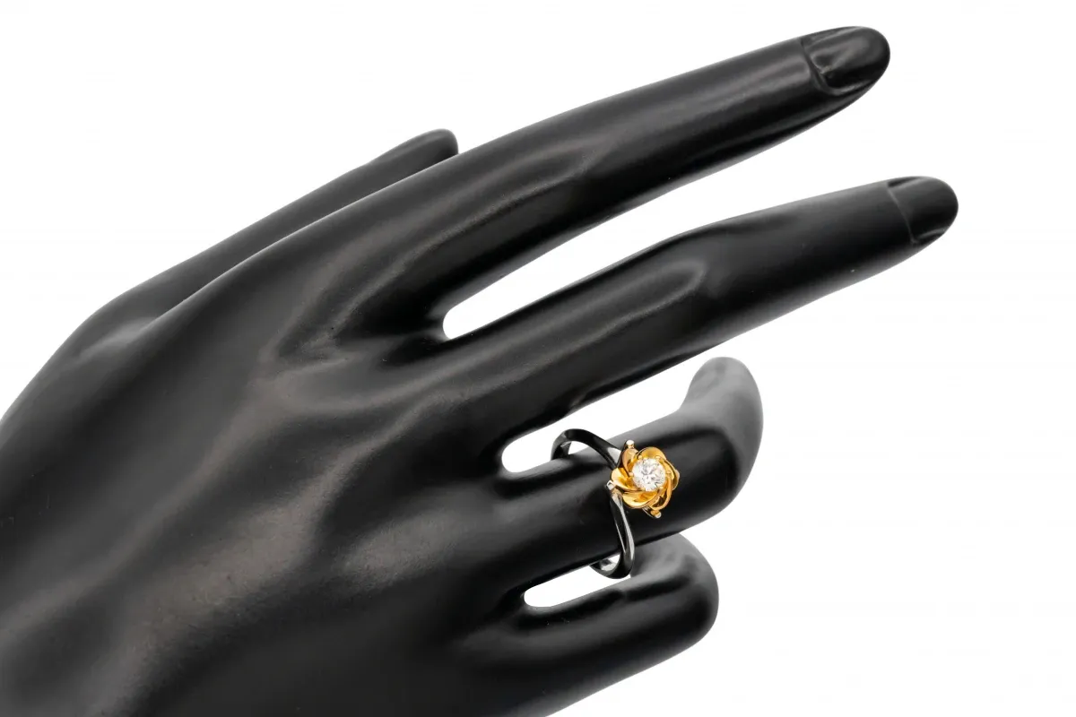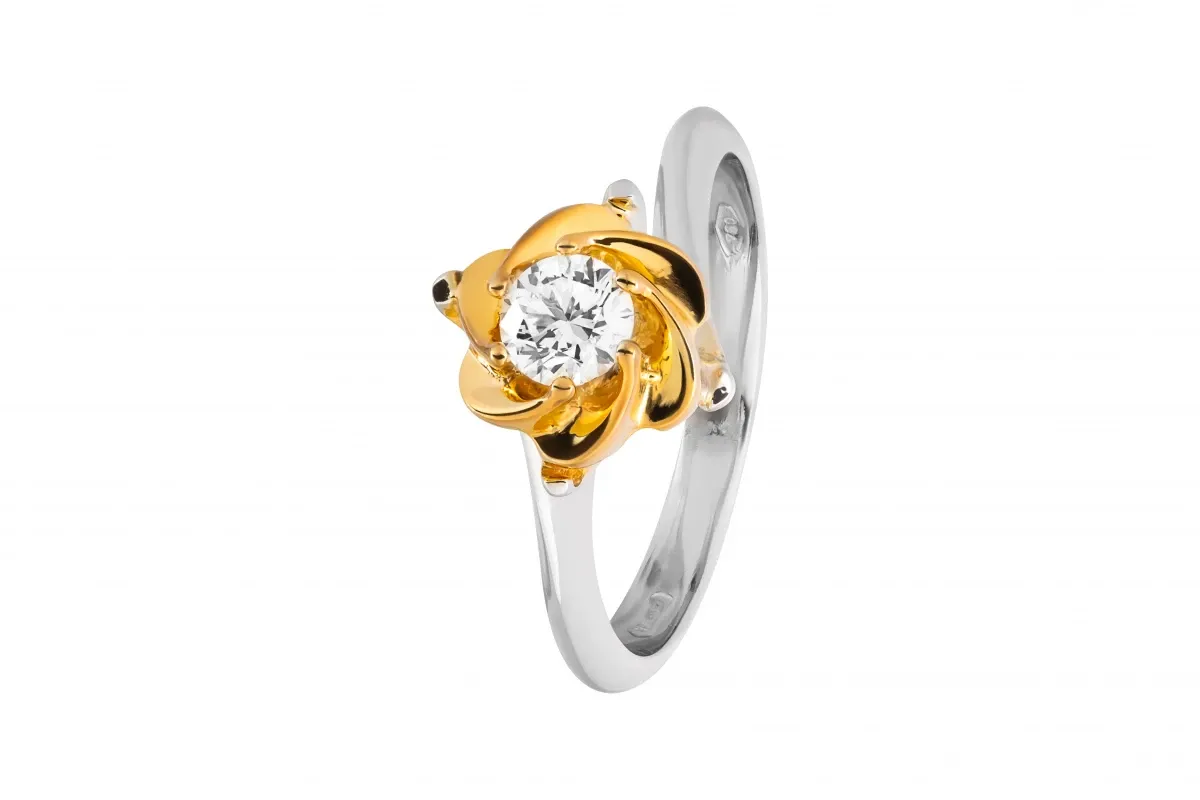 This 18ct White and Yellow Gold engagement ring features a stunning flower design with 0.28ct of diamonds, exuding elegance and charm.