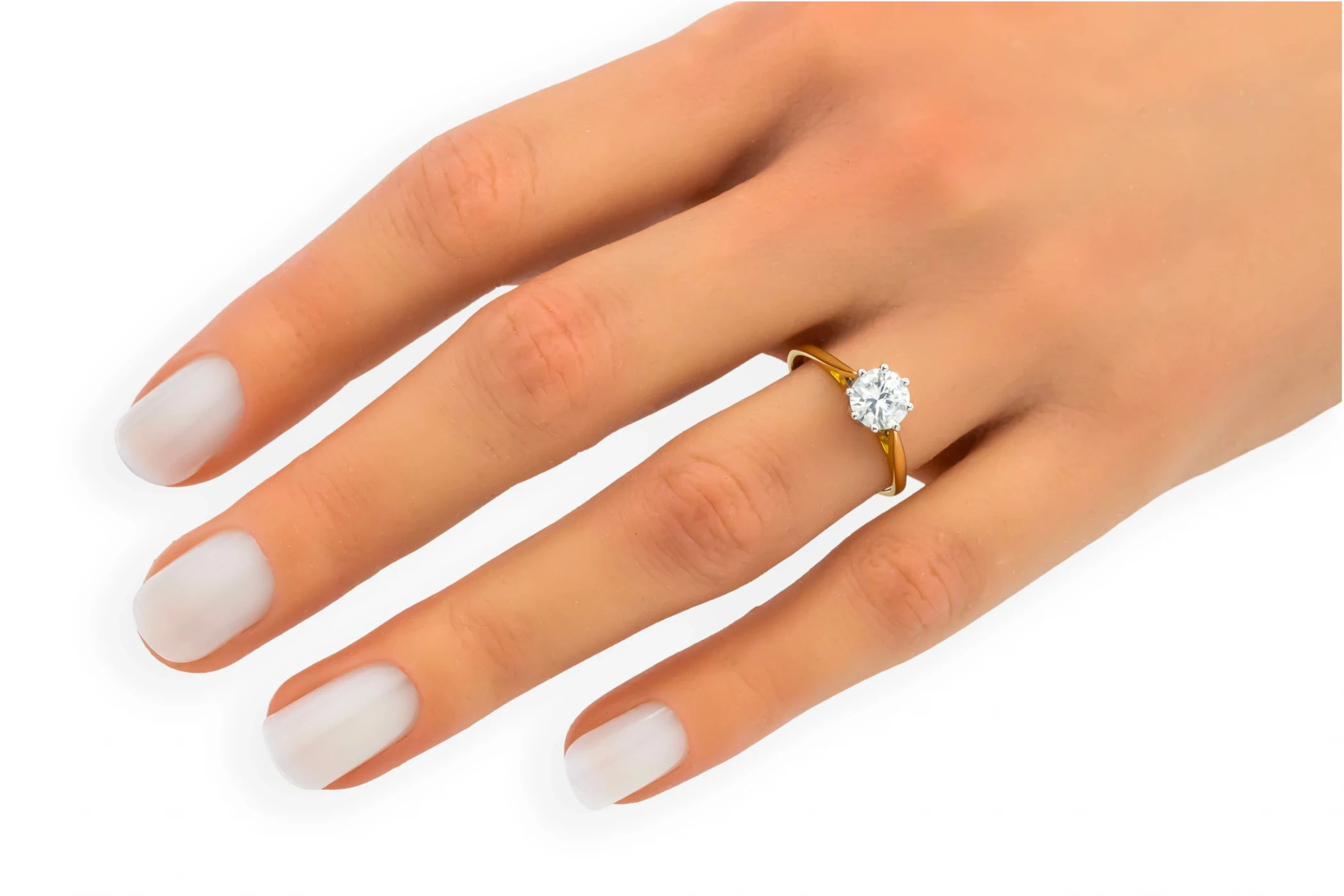 This striking 18ct yellow gold engagement ring showcases a 0.75ct brilliant round cut centre diamond