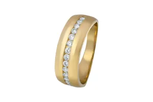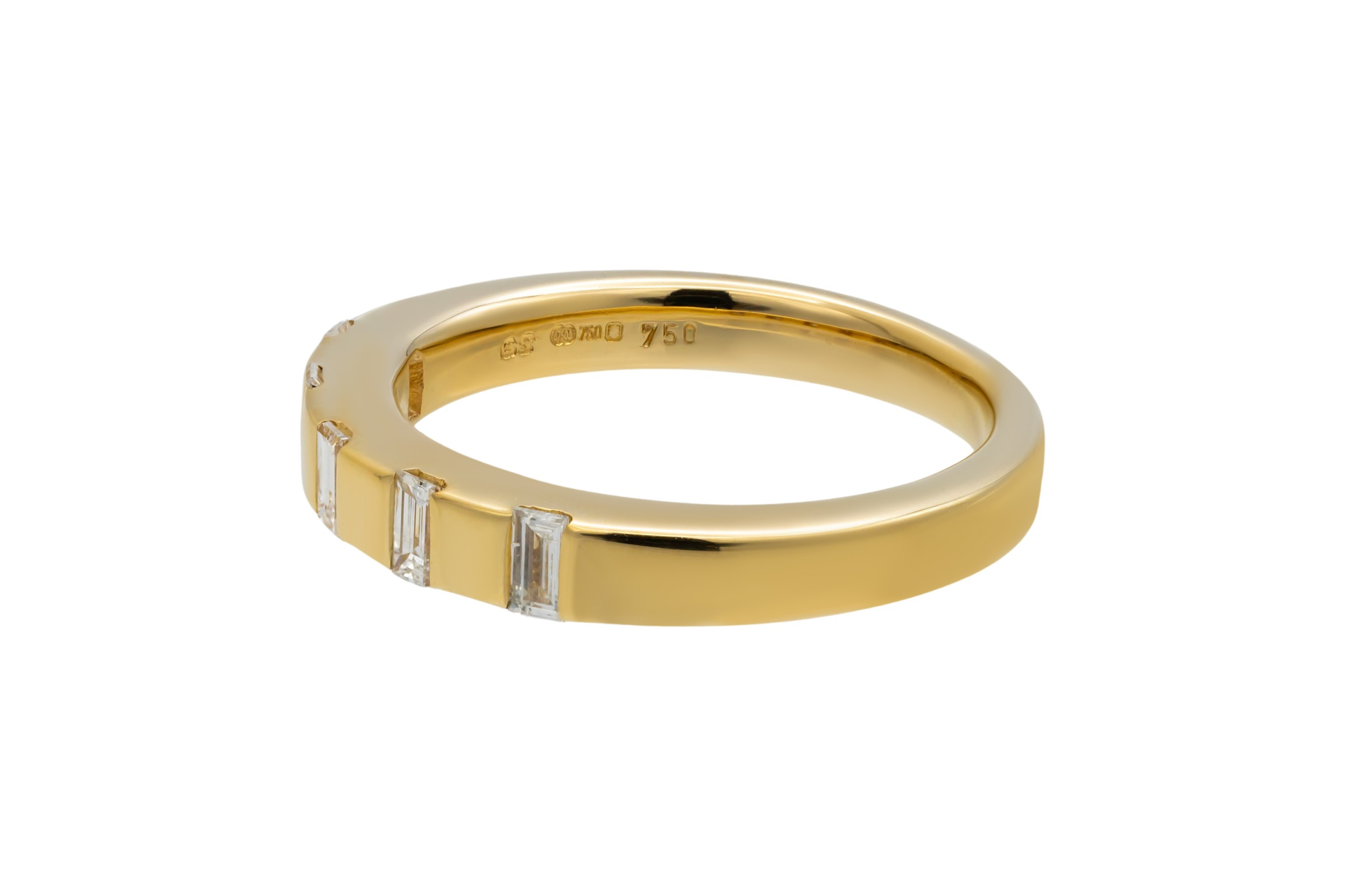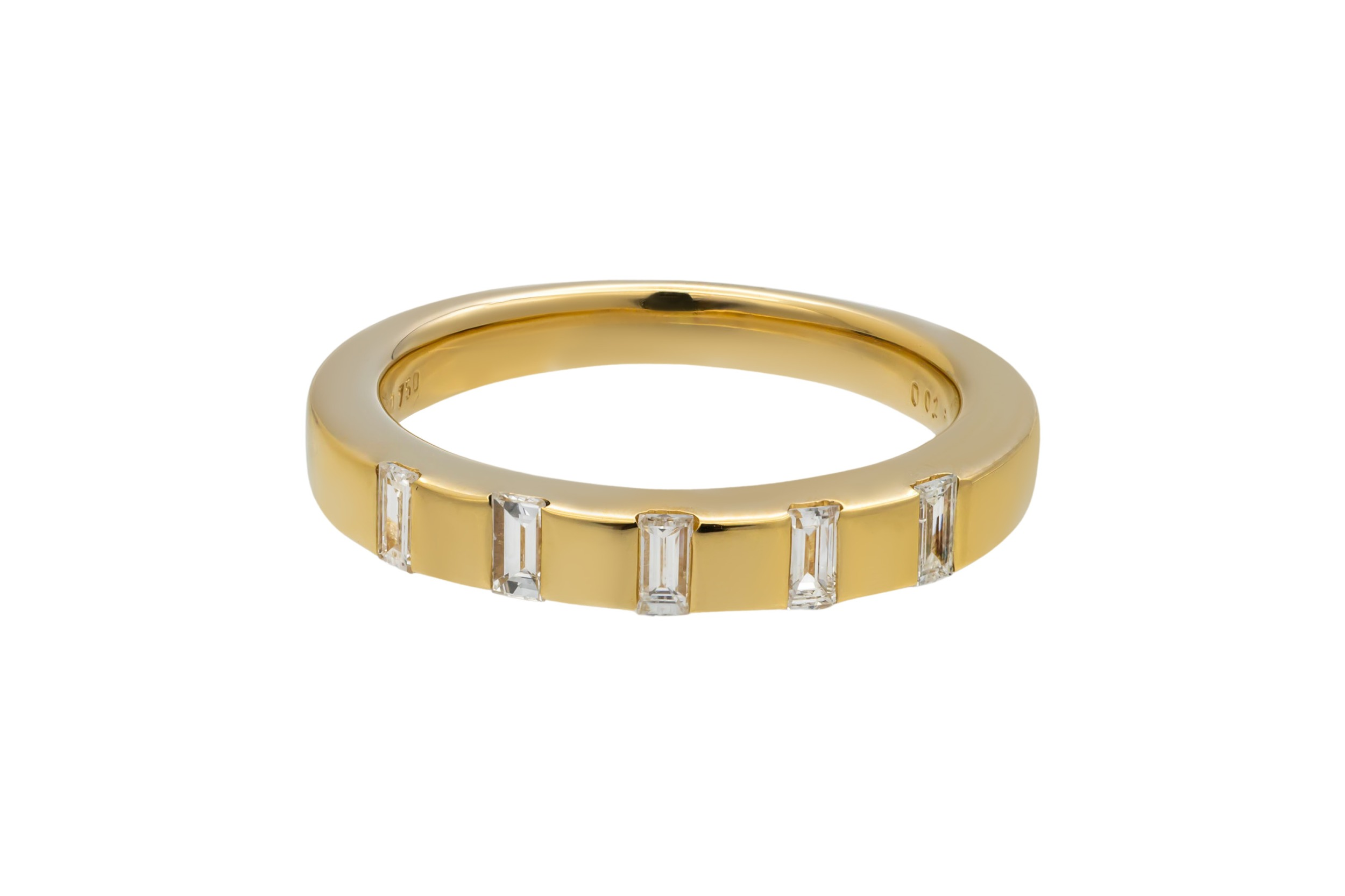 This refined 18ct yellow gold wedding band is set with 0.26ct of natural baguette cut diamonds, graded G colour with SI clarity for clean lines and subtle sparkle.