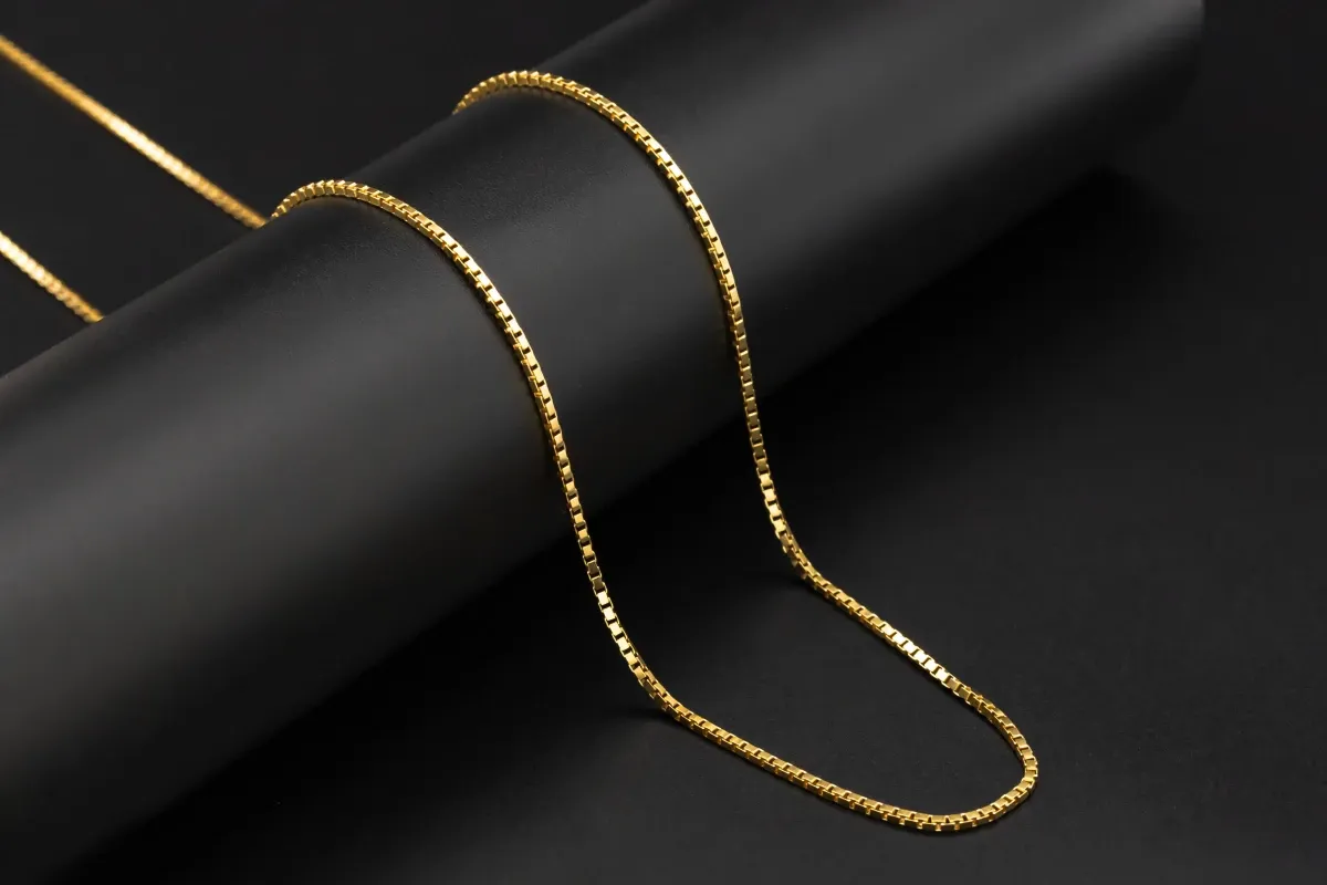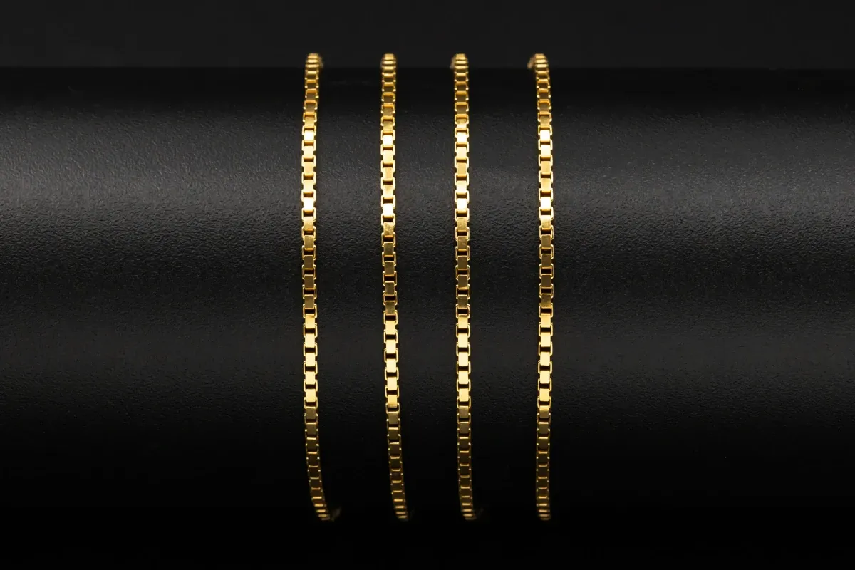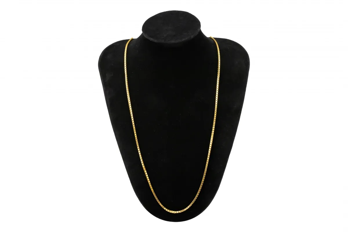 This 18ct Yellow Gold Box Chain, measuring 28 inches and weighing 14.6g, has a refined 1.5mm width.