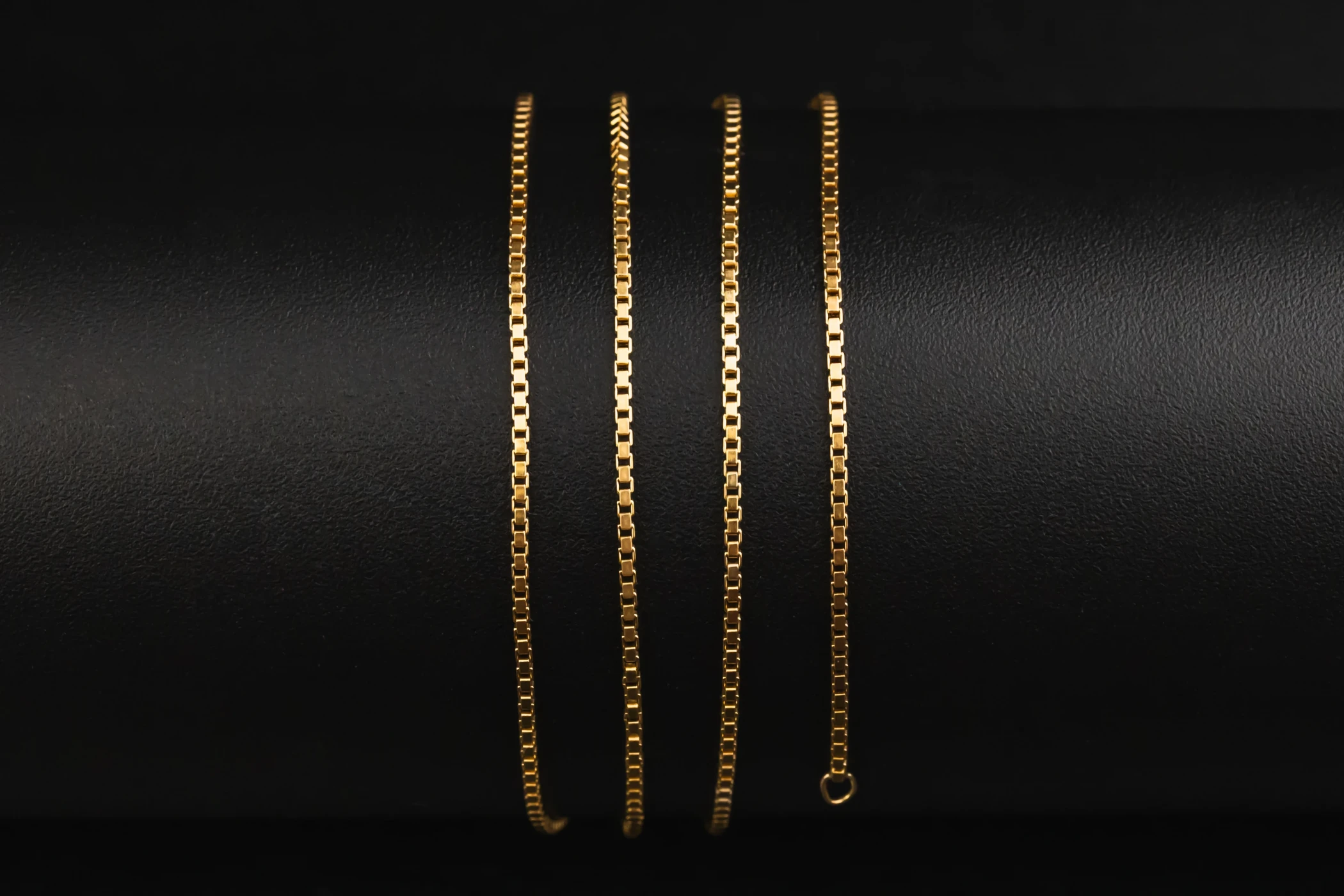 This timeless 18ct yellow gold box chain features a sleek, geometric link design measuring 1.28mm in width and 23 inches in length.