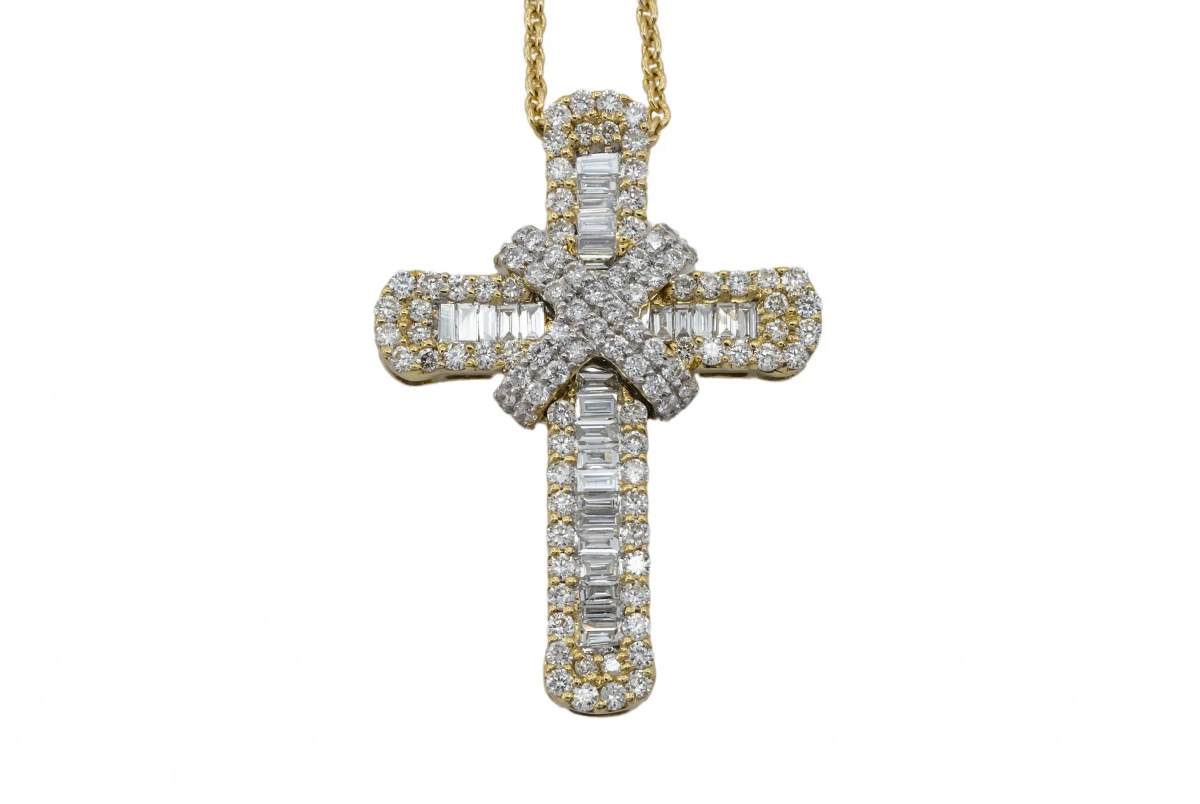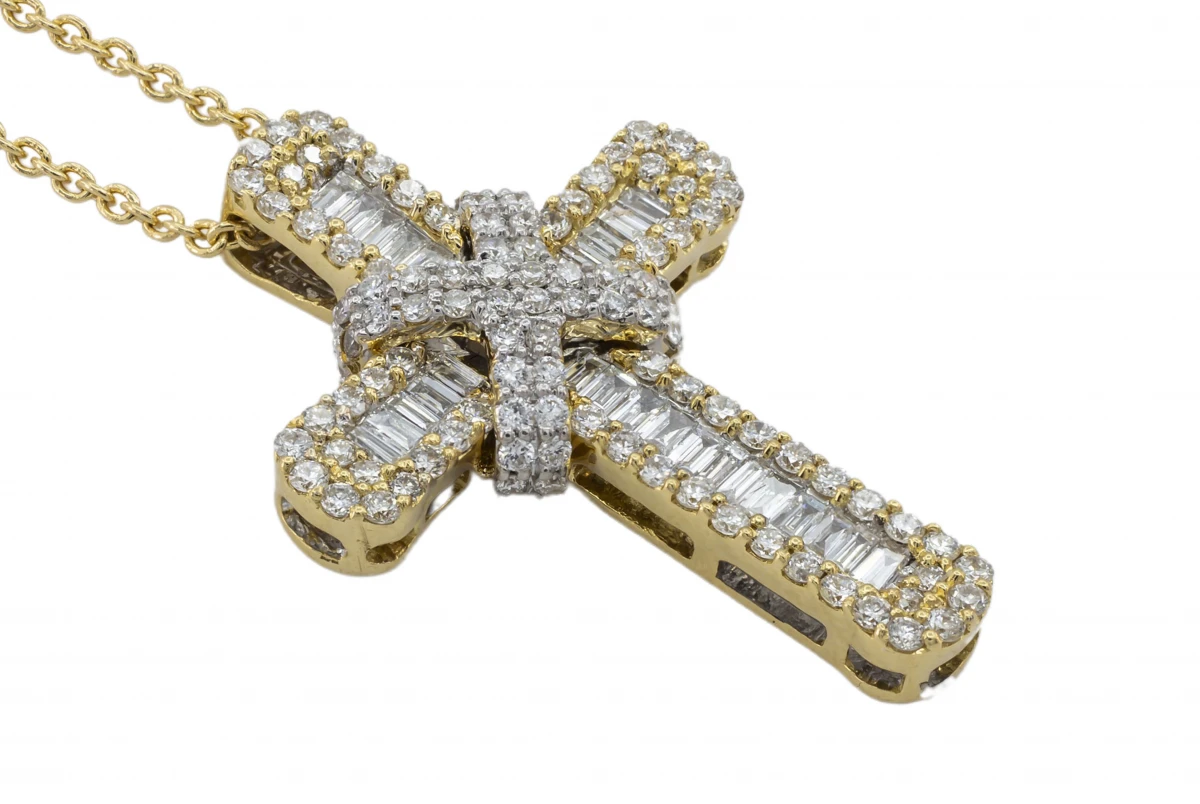 design is set with 0.57ct round brilliant-cut diamonds and 0.22ct baguette diamonds. g/h vs/vs1. The cross measures 1 inch long by 0.6 inch wide.
