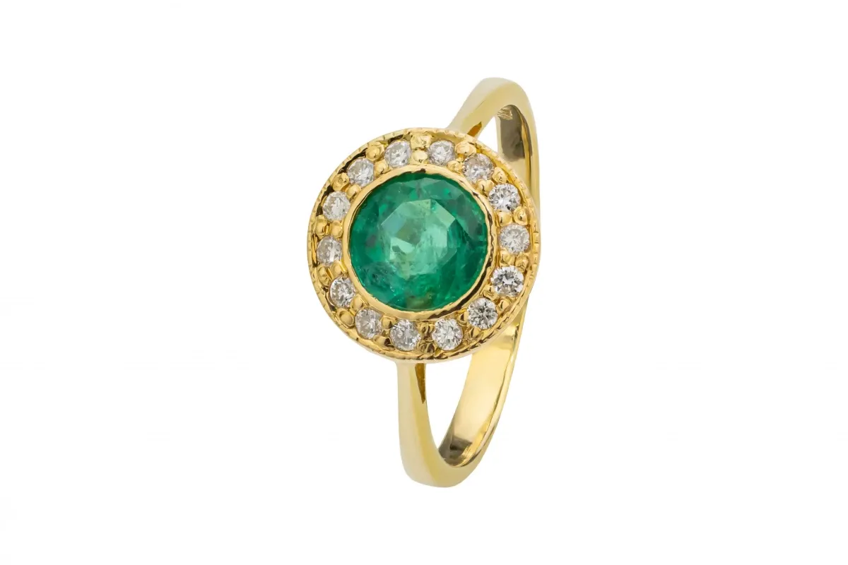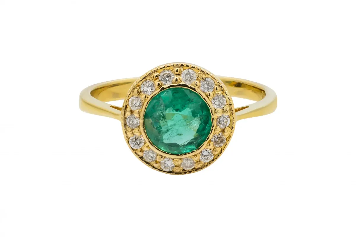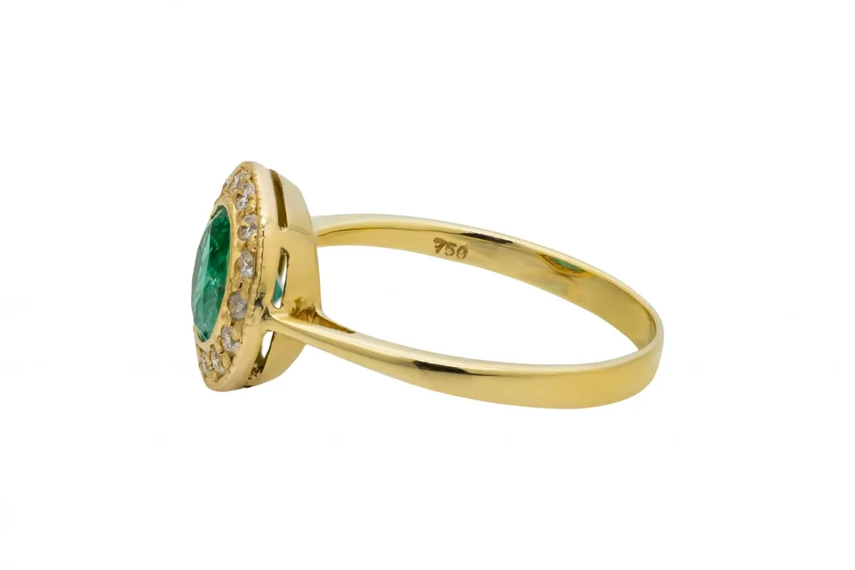 Elegant 18ct yellow gold ring featuring a brilliant 0.12ct diamond and a vivid 0.85ct emerald, weighing 2.60g and sized at L 1/2.