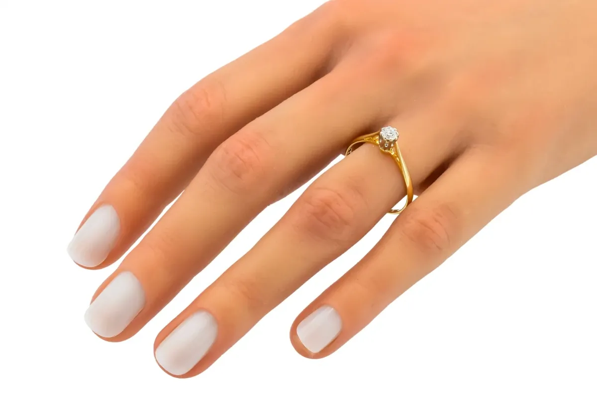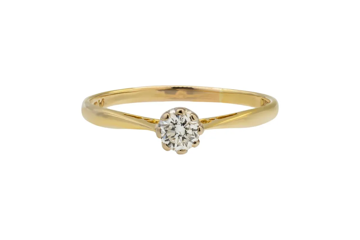 Crafted in warm 18ct yellow gold, this elegant engagement ring features a 0.22ct round brilliant cut diamond of G colour and SI1 clarity.