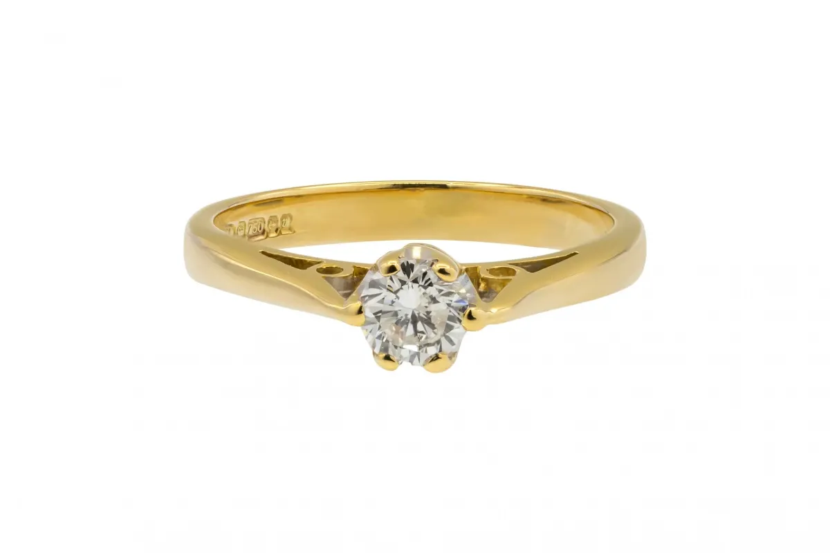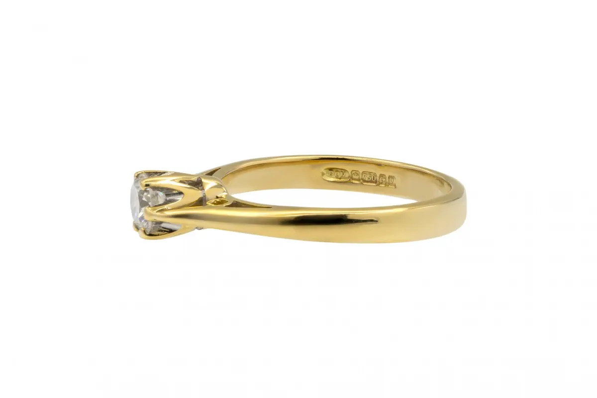 This elegant 18ct yellow gold engagement ring showcases a stunning 0.26ct G colour, VS clarity round brilliant diamond.