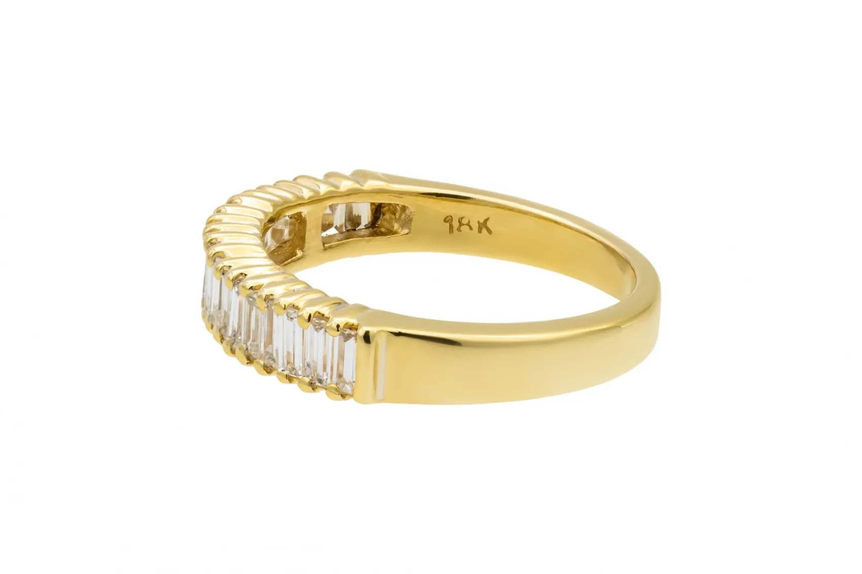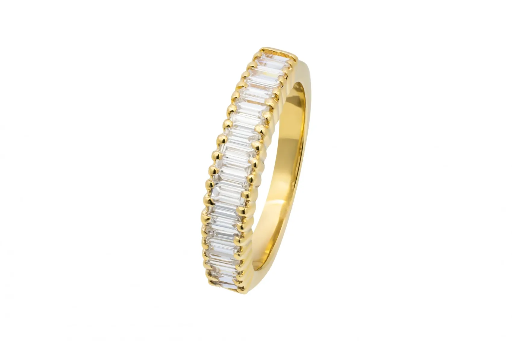This refined 18ct yellow gold half eternity ring is set with 0.48ct of baguette cut diamonds, graded G colour with SI clarity for clean lines and elegant sparkle.