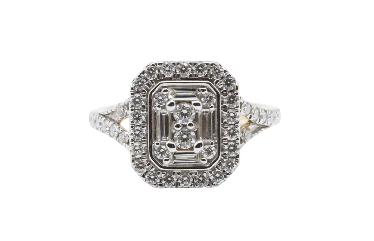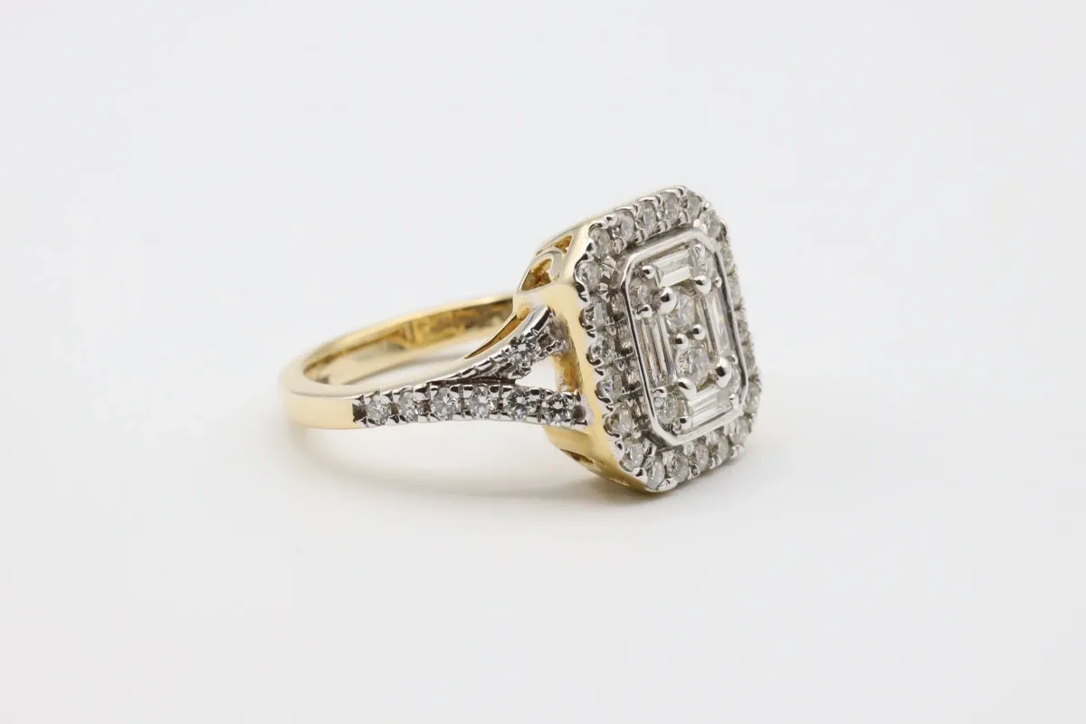 A 18ct yellow gold diamond engagement ring featuring 6 round cut brilliant diamonds and 4 baguette diamonds in the center.