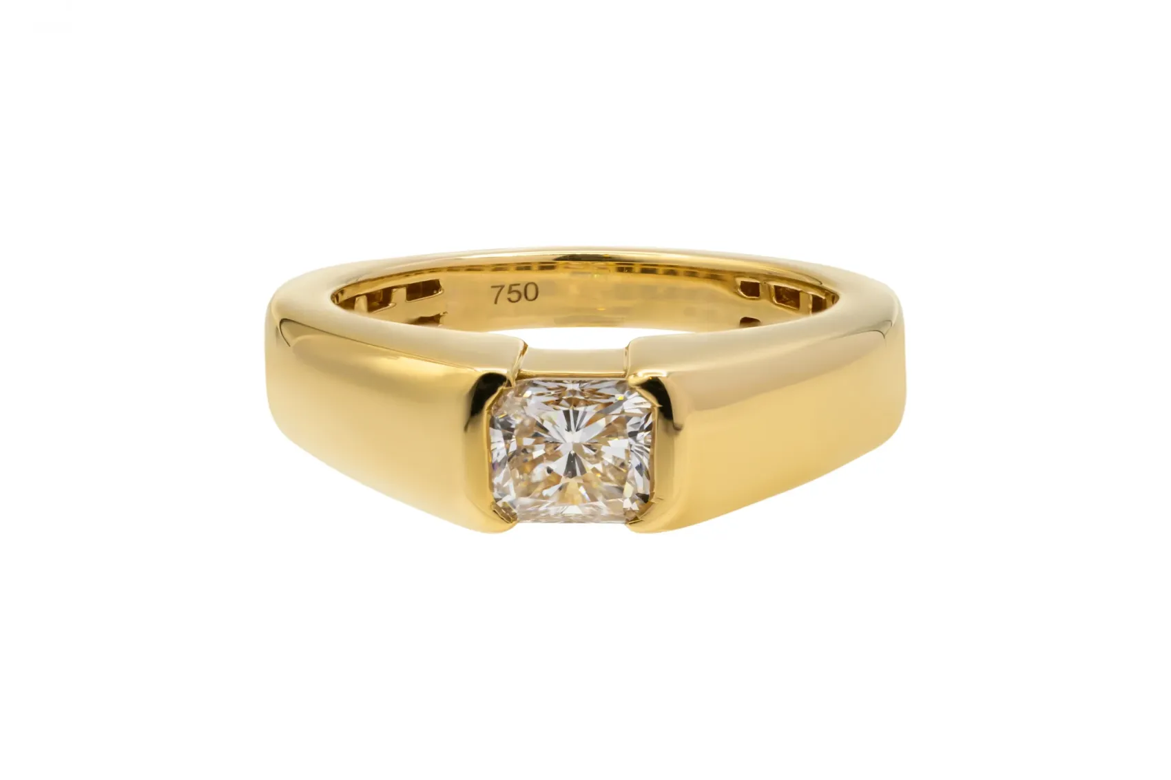 This striking 18ct yellow gold ring features a 1.03ct cut-corner rectangular modified brilliant diamond, certified by GIA.