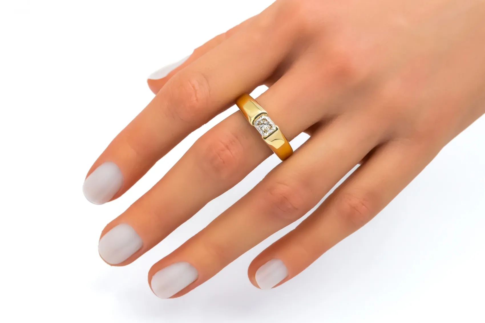 Graded L colour with I2 clarity, the diamond showcases a unique faceted style that enhances light reflection and presence. Set on a substantial 6mm band weighing 8g, and finished in size O, this ring is a bold and distinctive statement piece, perfect for collectors of unique diamond cuts or as a one-of-a-kind engagement ring.