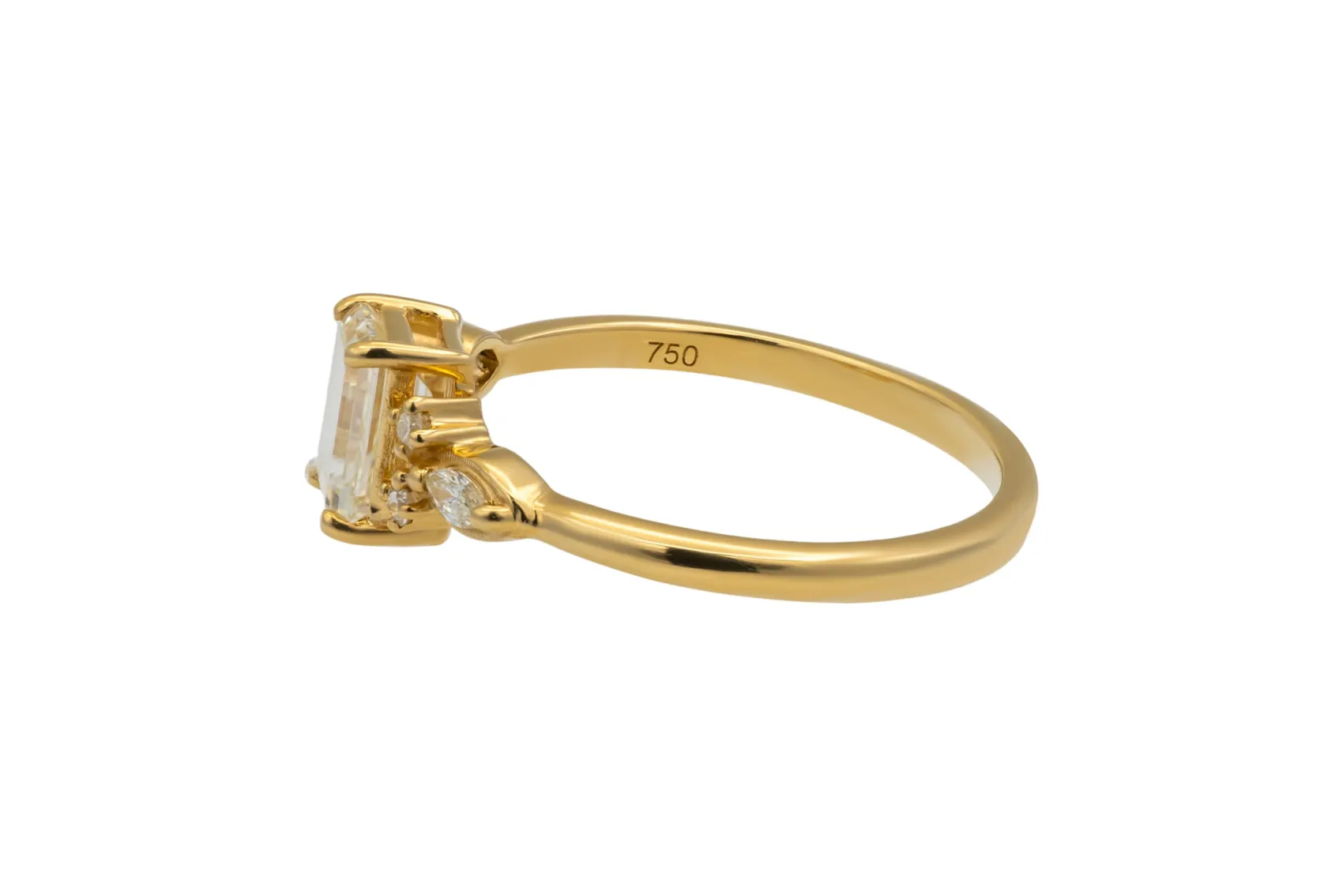 Crafted in 18ct yellow gold, this engagement ring is set with a 0.89 carat diamond graded J colour and VS2 clarity, GIA certified for assurance.