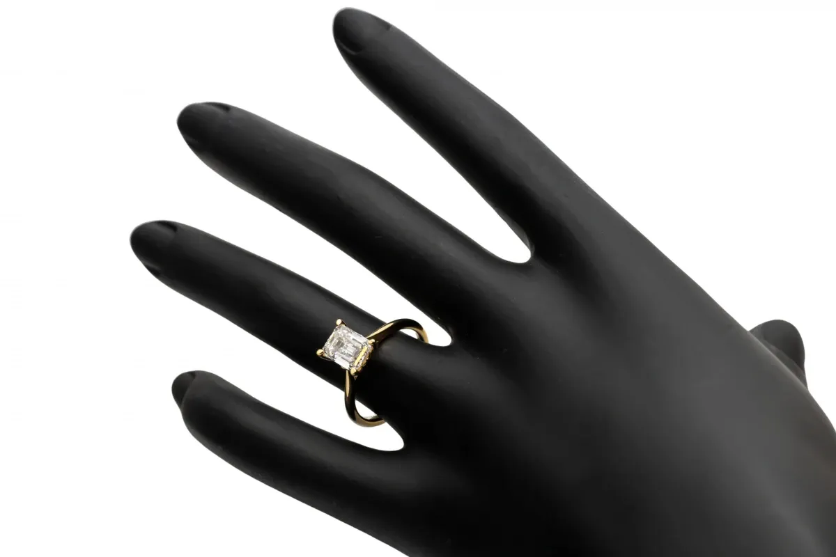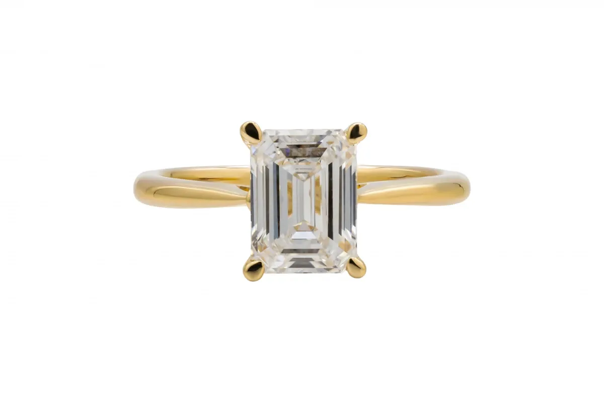 This 18ct Yellow Gold Engagement Ring highlights a breathtaking 1.83ct lab-grown emerald-cut diamond, certified by IGI.