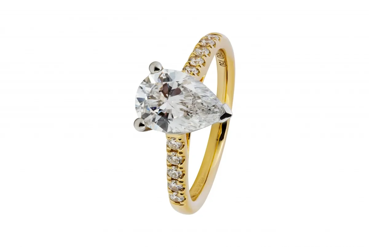 This exquisite solitaire ring showcases a 1.58ct E VS1 Pear Lab-Created Diamond, set in a sophisticated 18ct Yellow Gold band with a Platinum gallery.