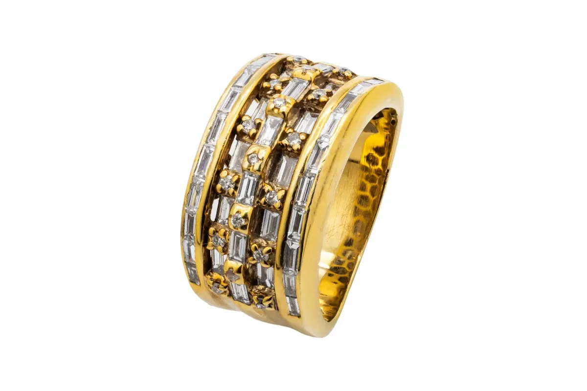 Indulge in opulence with our 18ct Yellow Gold Diamond Ring, featuring a mesmerizing 1.59 carats of baguette and brilliant cut diamonds.