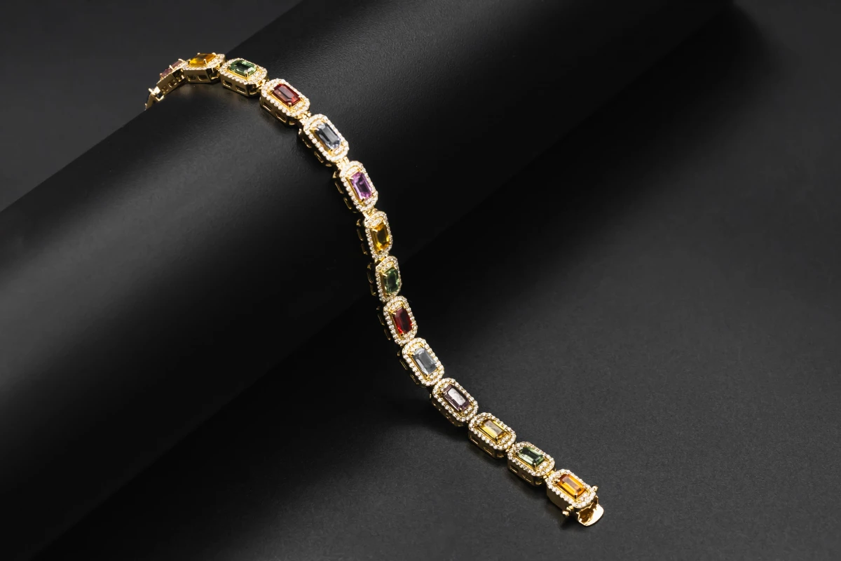 This exquisite 18ct yellow gold Tutti Frutti bracelet features 1.54ct of sparkling diamonds and 6.06ct of vibrant gemstones, perfectly capturing elegance and color.