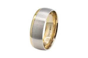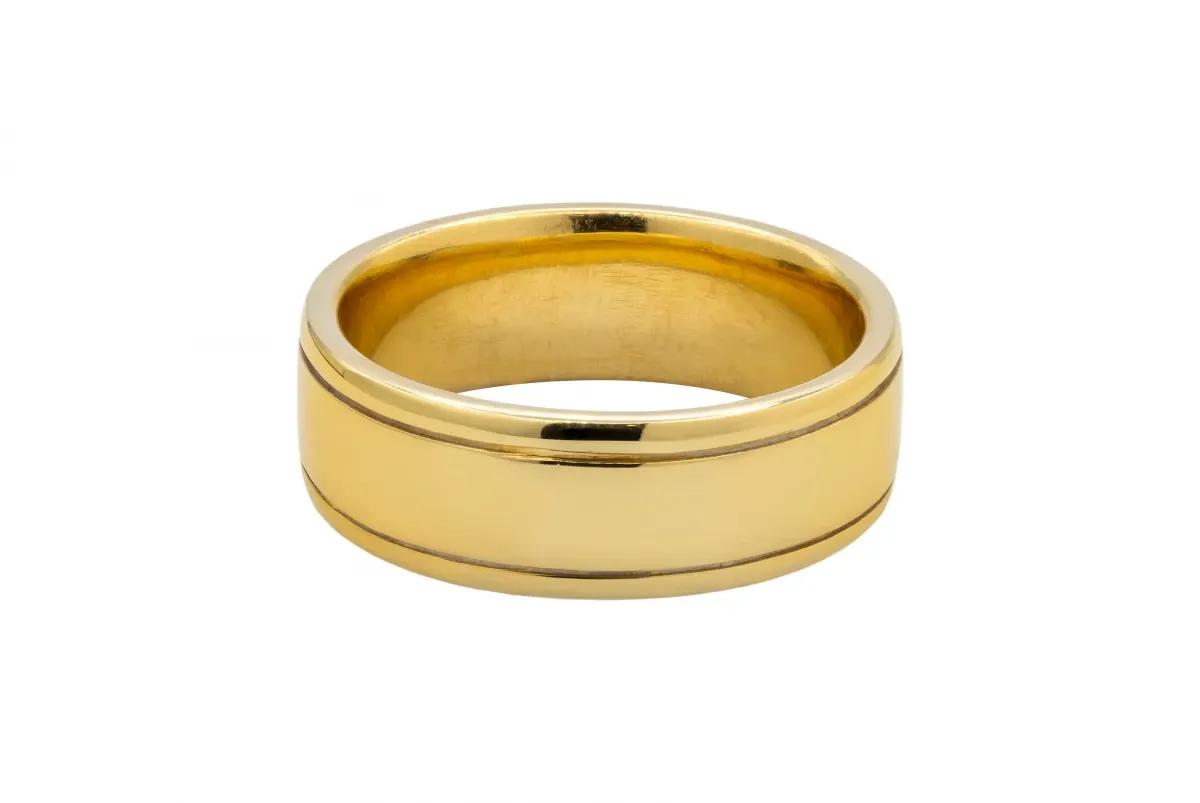 A ring of two halves, this design features a polished mirror finish on one half, contrasted by a satin finish on the other and separated by two grooves across the circumference of the ring.