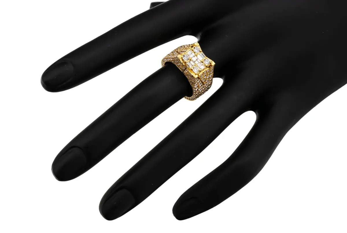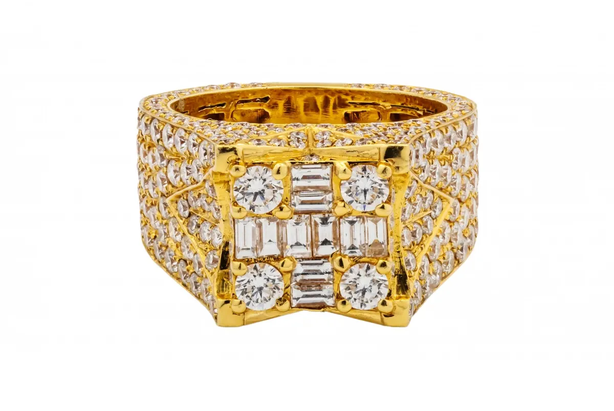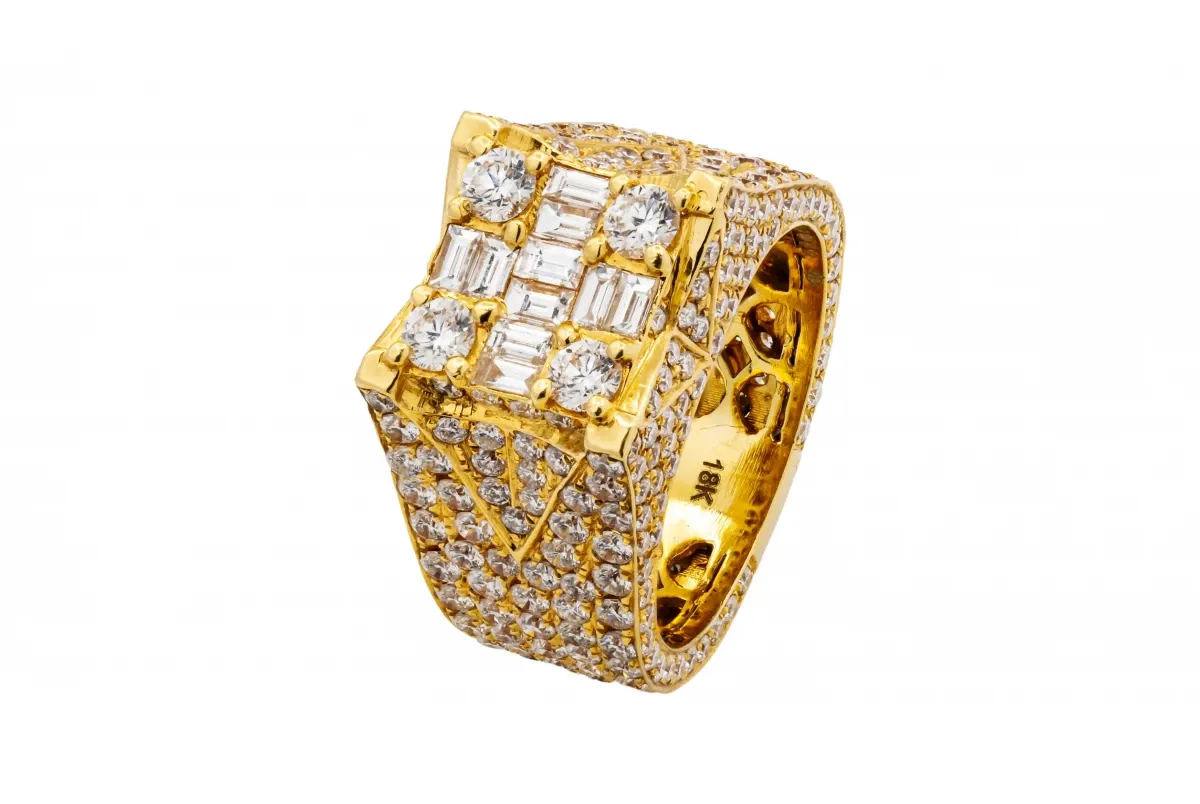 A 18ct Yellow gold mens diamond ring which has round cut brilliant and baguette diamonds in the centre piece.