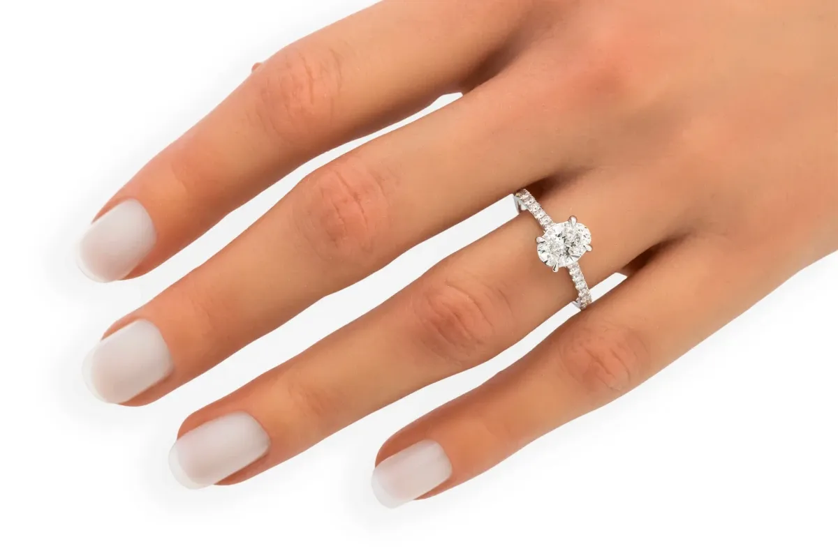 A stunning 18ct white gold engagement ring featuring a 1.04ct VVS2 E-colour oval cut lab grown diamond, beautifully accented with a 0.15ct diamond set mount for a total carat weight of 1.19ct.