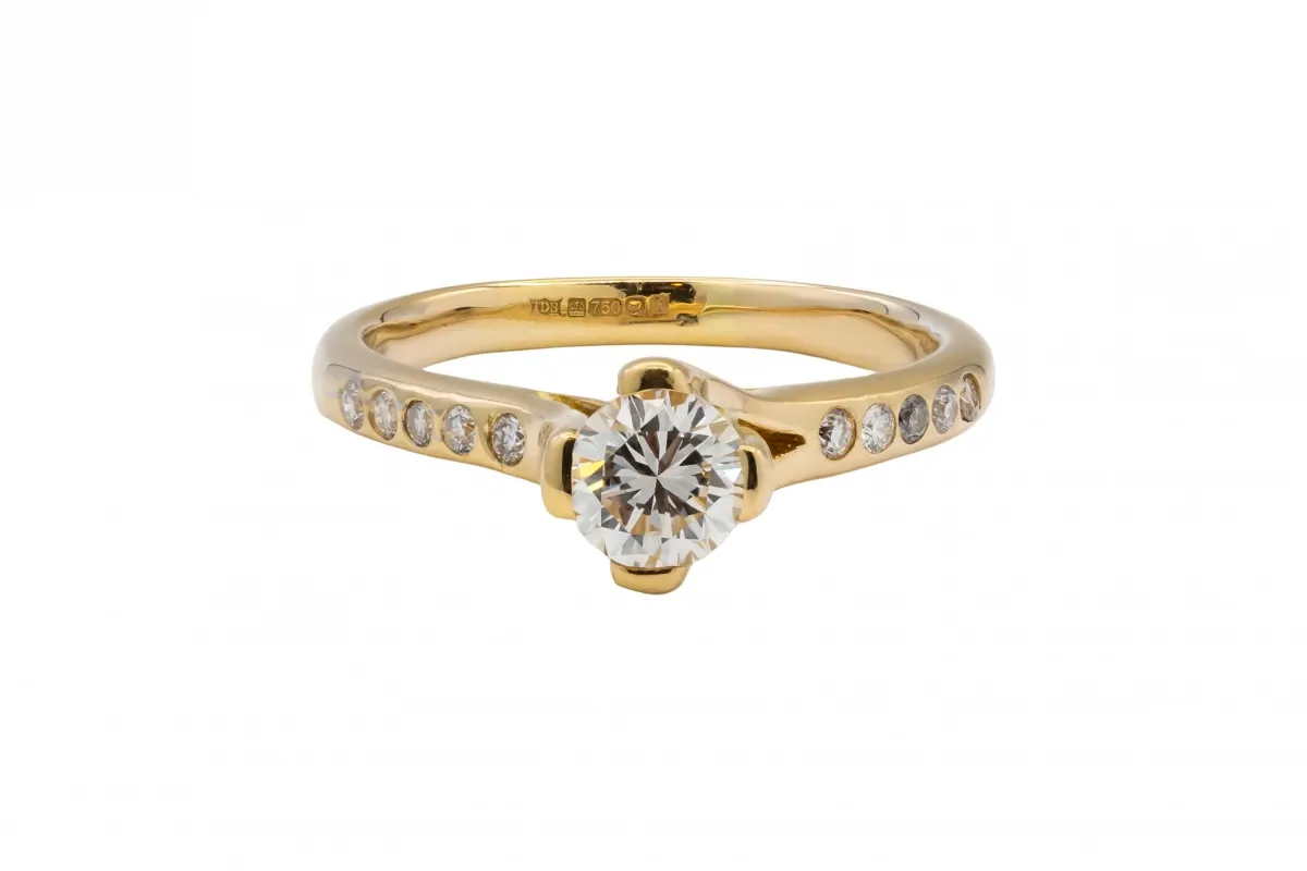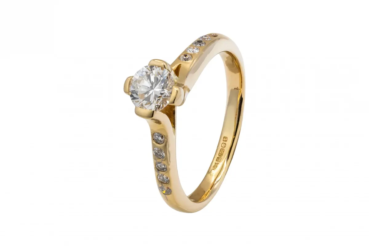 This stunning 18ct yellow gold engagement ring features a brilliant 0.70ct diamond, graded G for colour and VS2 for clarity.
