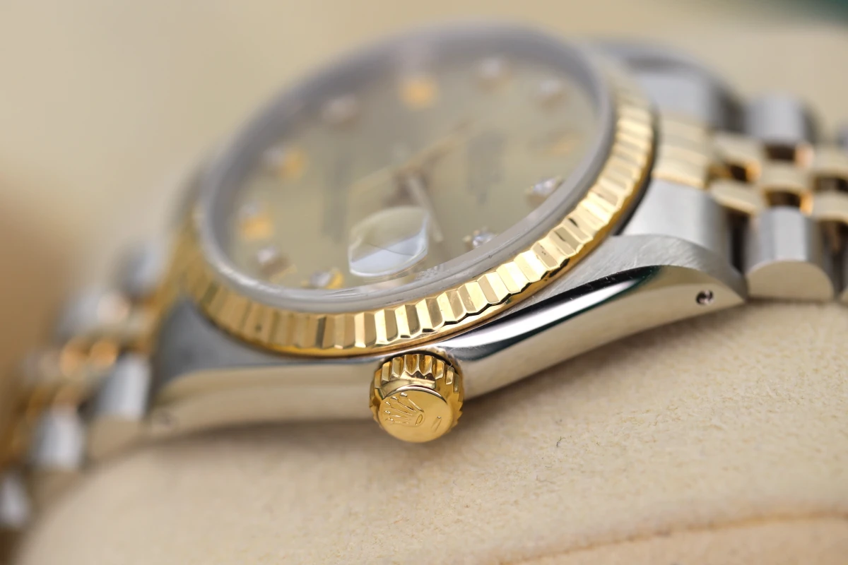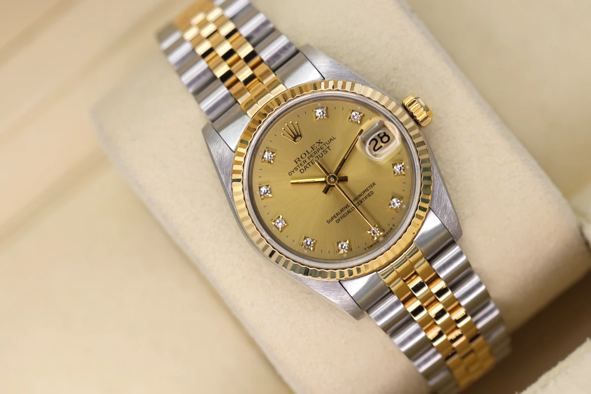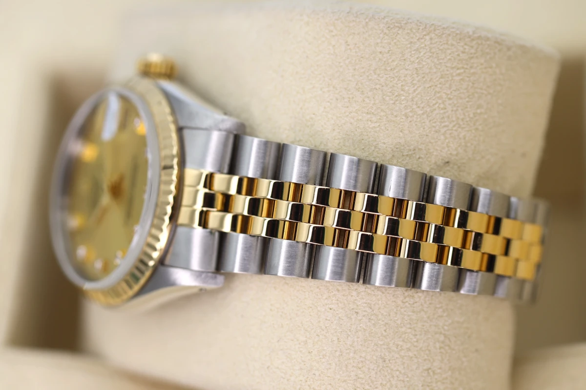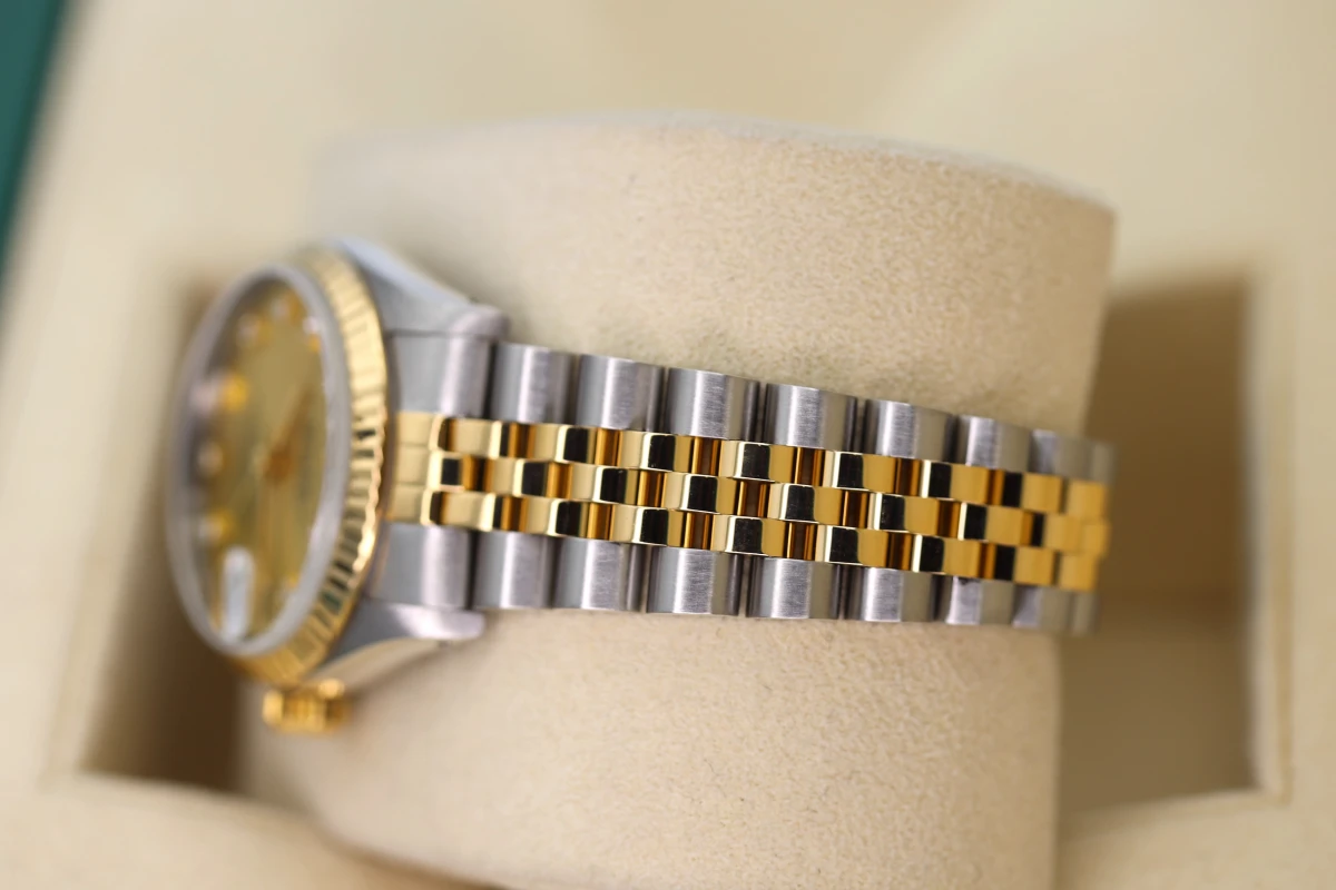 Pre-owned, Fully refurbished & serviced in house we have for sale a 1998 Rolex Datejust made from stainless steel & 18ct Yellow gold with its 31mm steel case it makes the perfect size for a woman. The champagne gold 10 diamond dot dial is in fantastic condition showing no signs of age. Ref 68273 Box & invoice and 12 month warranty. This watch does not have original Rolex Papers.