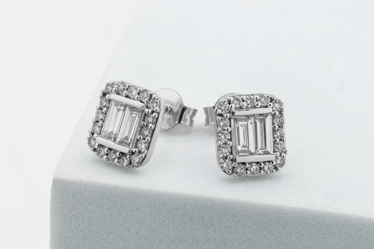 These exquisite earrings feature a dazzling combination of baguette and brilliant-cut diamonds, totaling an impressive 1 carat.