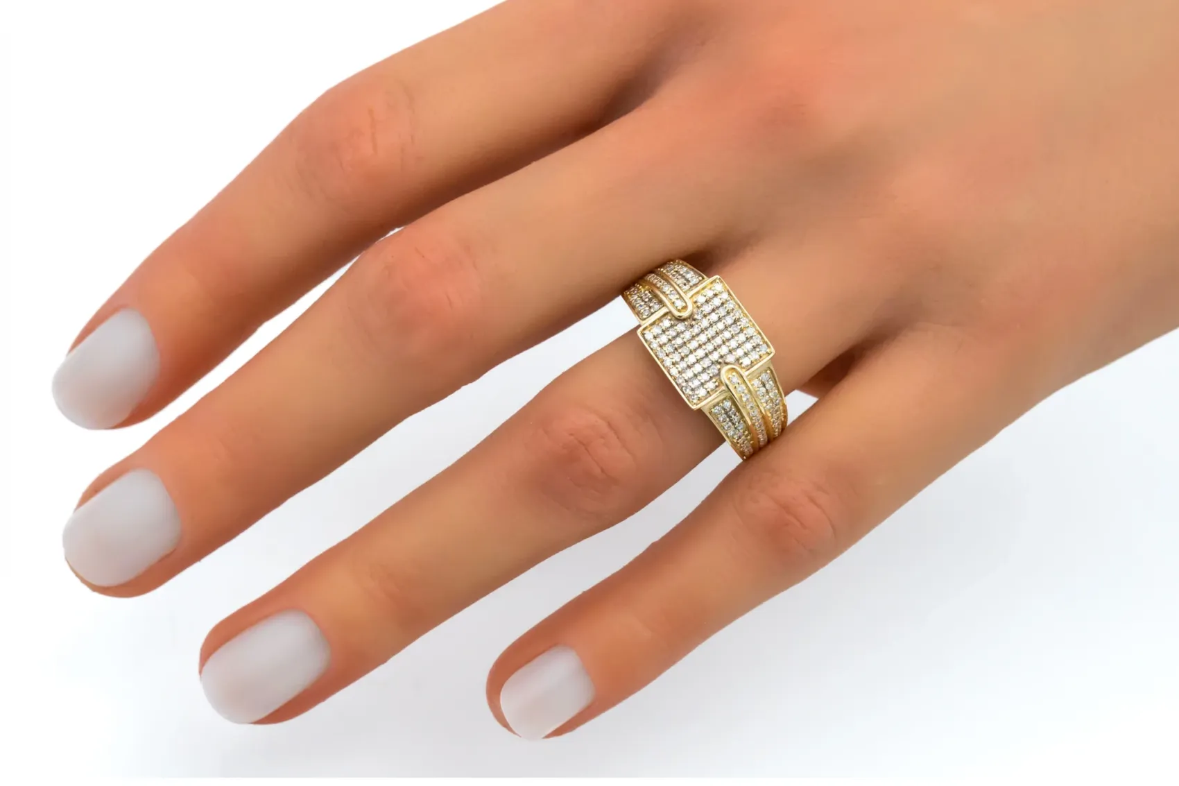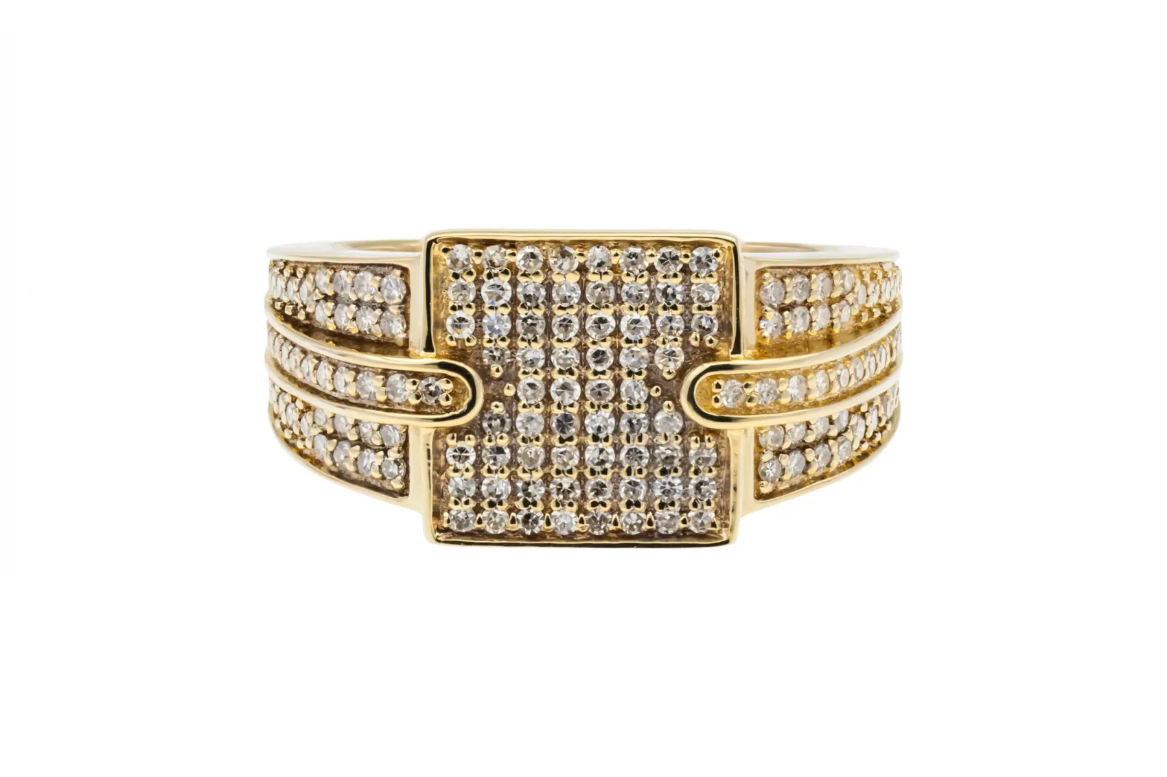 This bold 9ct yellow gold men’s ring showcases a striking square design set with 0.90ct of round brilliant cut diamonds, graded G colour with SI clarity.
