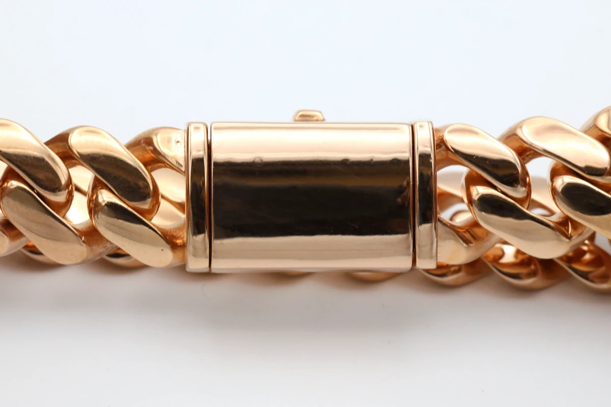9ct rose gold Cuban design bracelet weighing 78.8g, available in various colours and sizes.