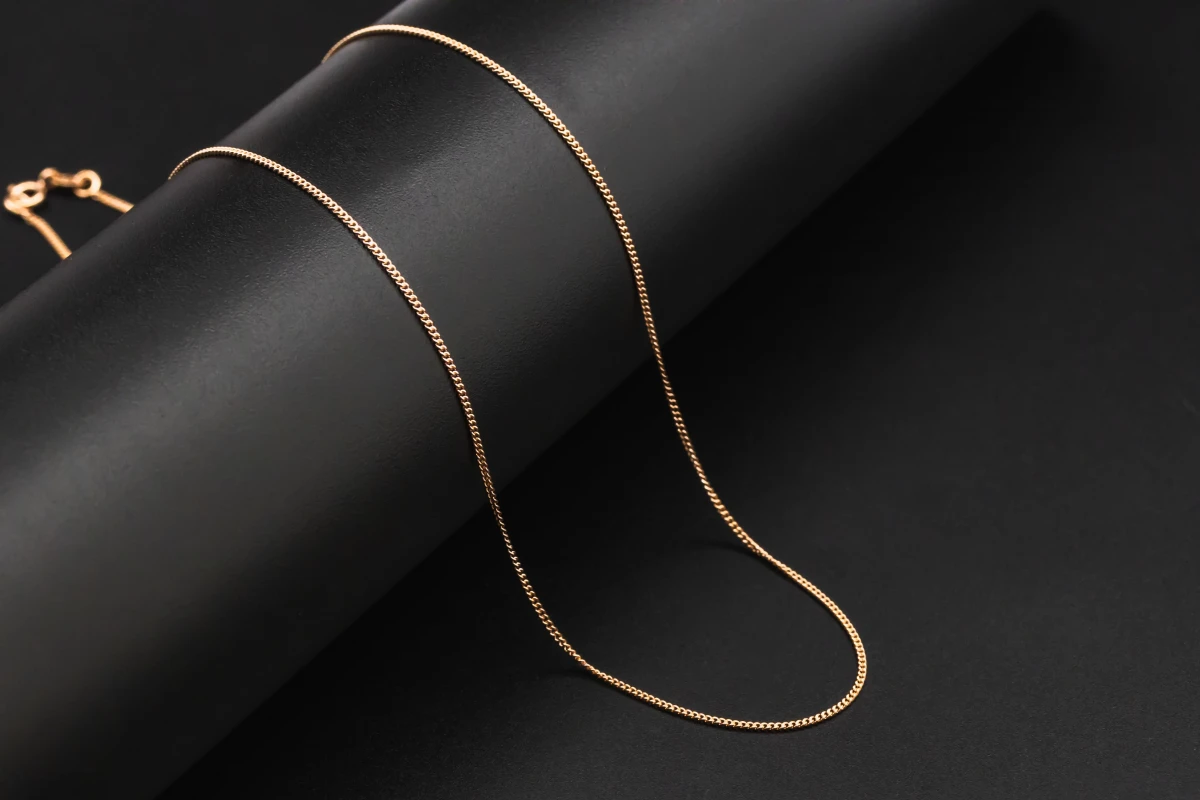 This 9ct rose gold curb chain weighs 1.4g and measures 16 inches in length.