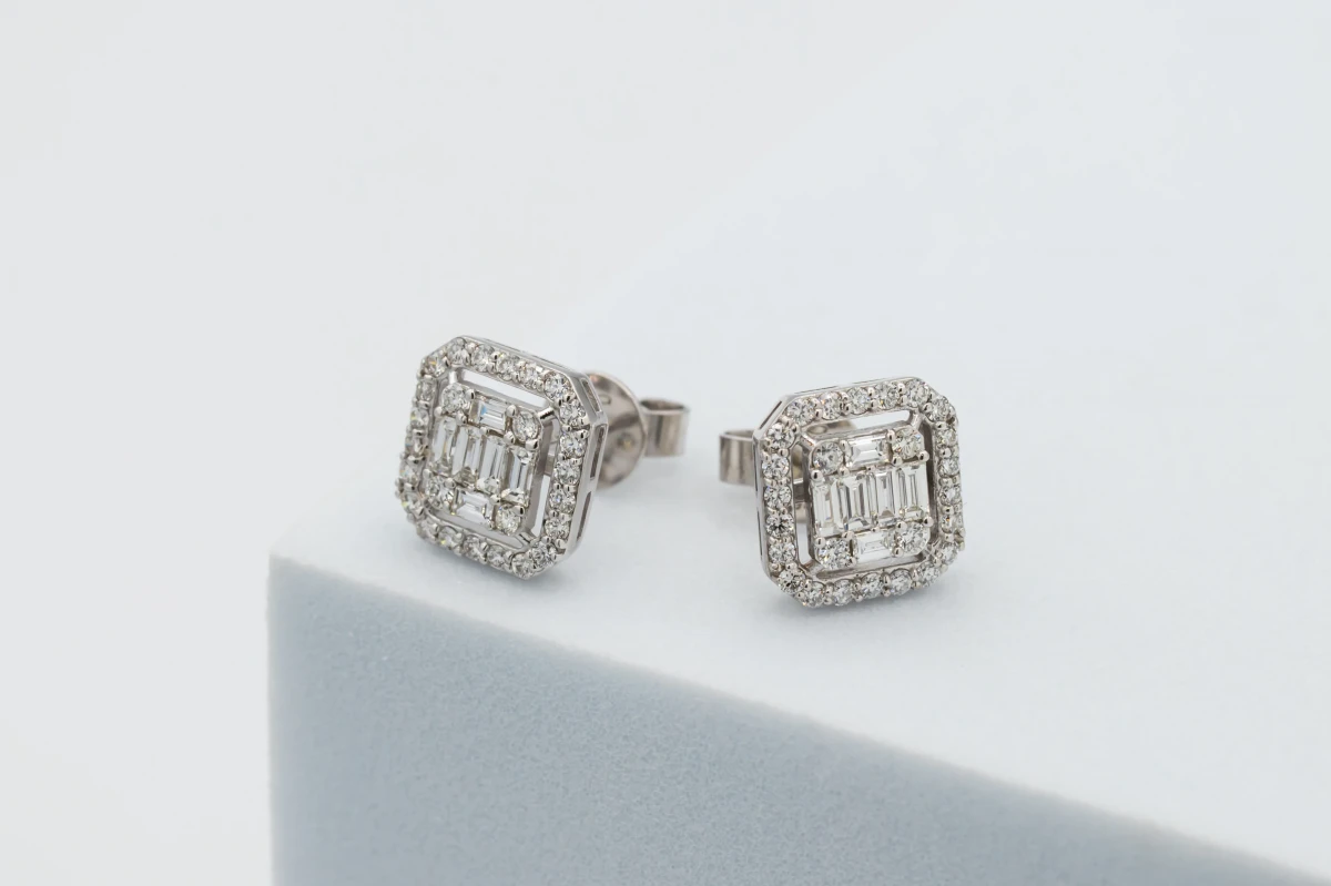 These elegant 9ct white gold stud earrings feature a stunning combination of baguette and round-cut diamonds, totaling 0.71ct G VS, for a sophisticated sparkle.
