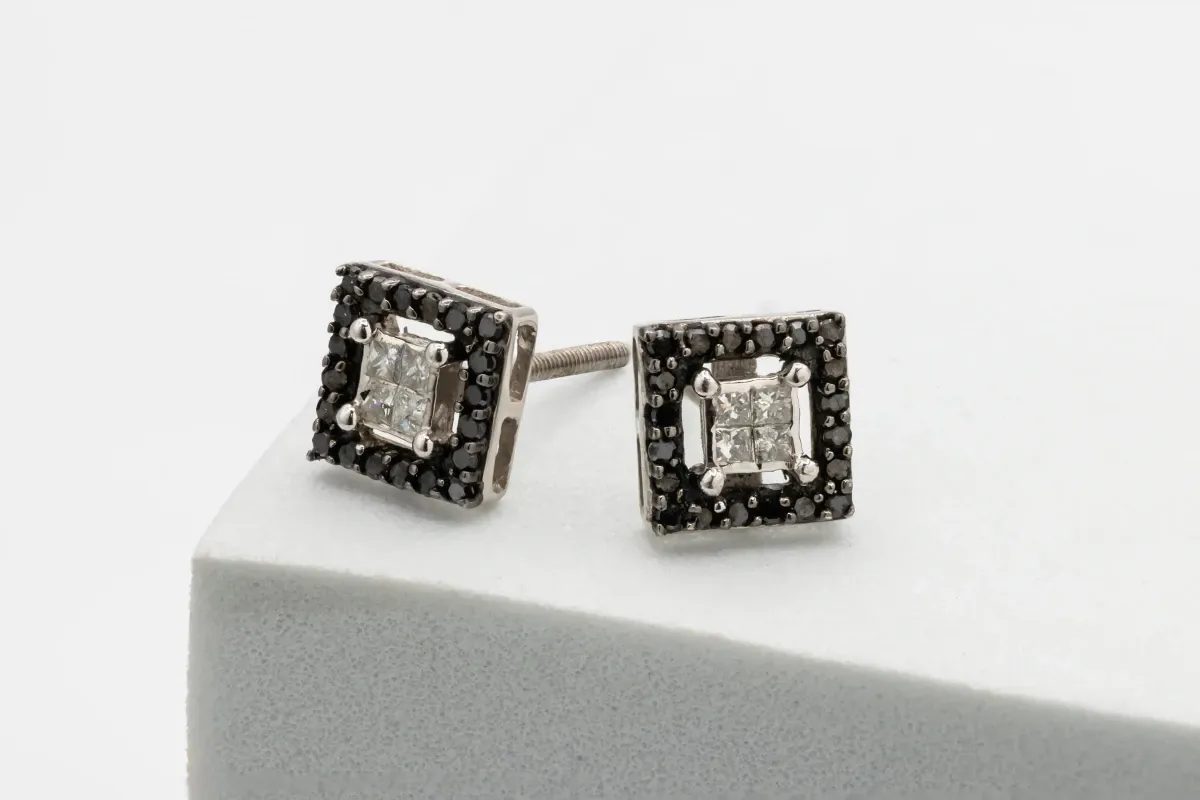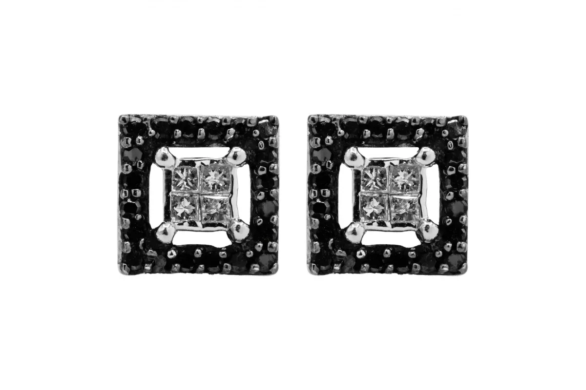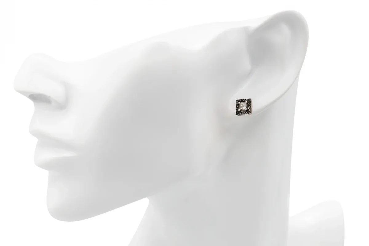 Featuring a stunning princess-cut 0.35ct white diamond surrounded by smaller black diamonds. Weighing 2g in total and boasting G colour and Si1 clarity, these earrings measure 7x7mm.