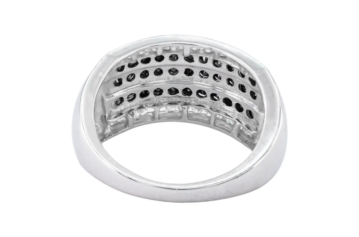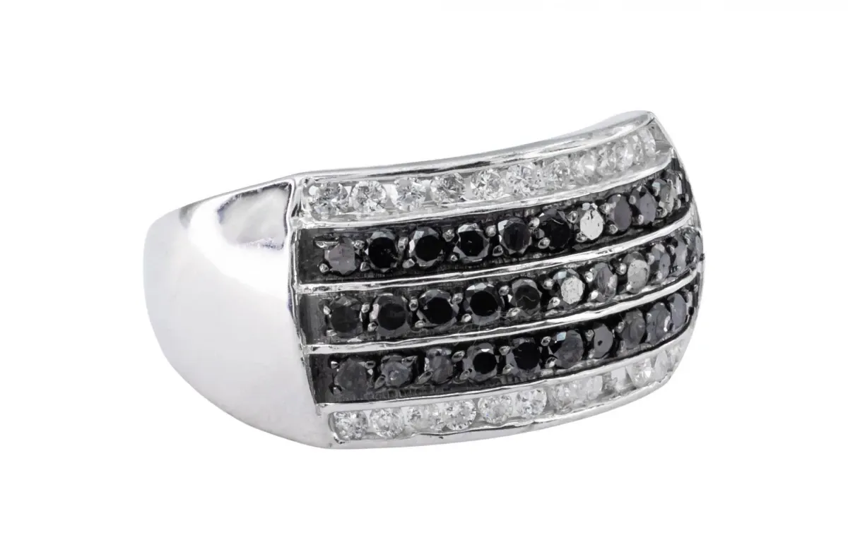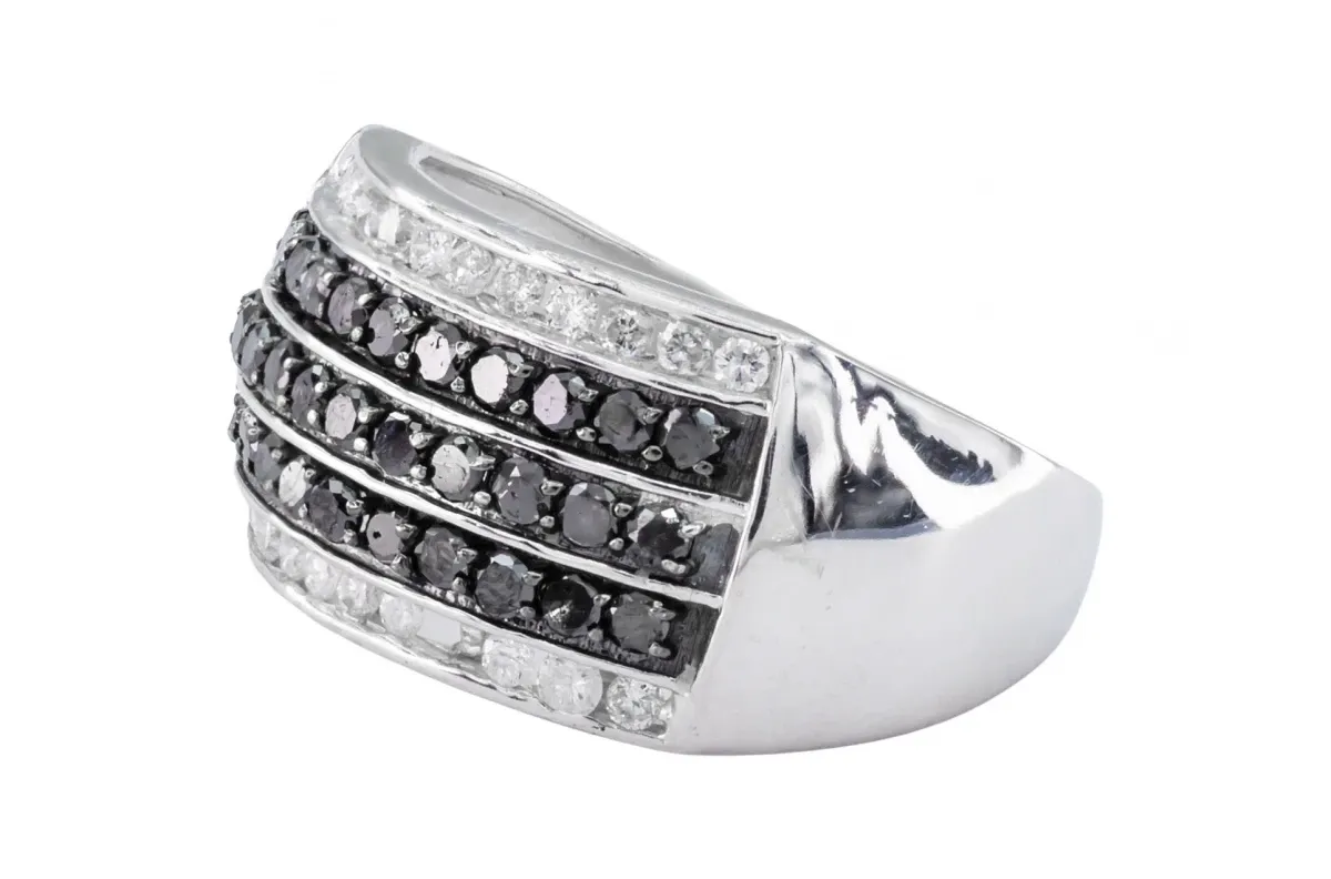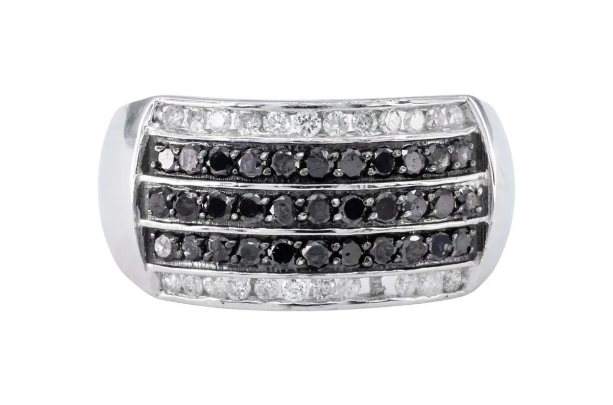 The deep round brilliant black diamonds in this stunning ring contrast beautifully with the crisp sparkle of the dazzling white diamonds worth 1.01cts.