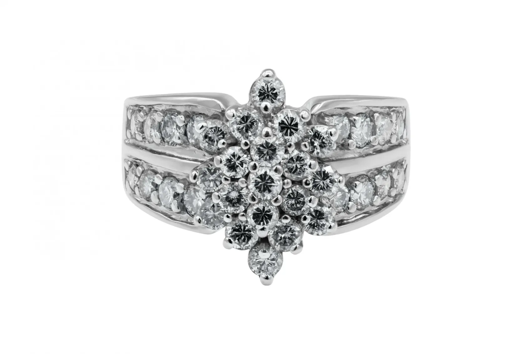 This luxurious 9ct white gold ring features an impressive cluster design set with 2.11ct of round brilliant cut diamonds, graded F colour with VS clarity for exceptional sparkle and fire.