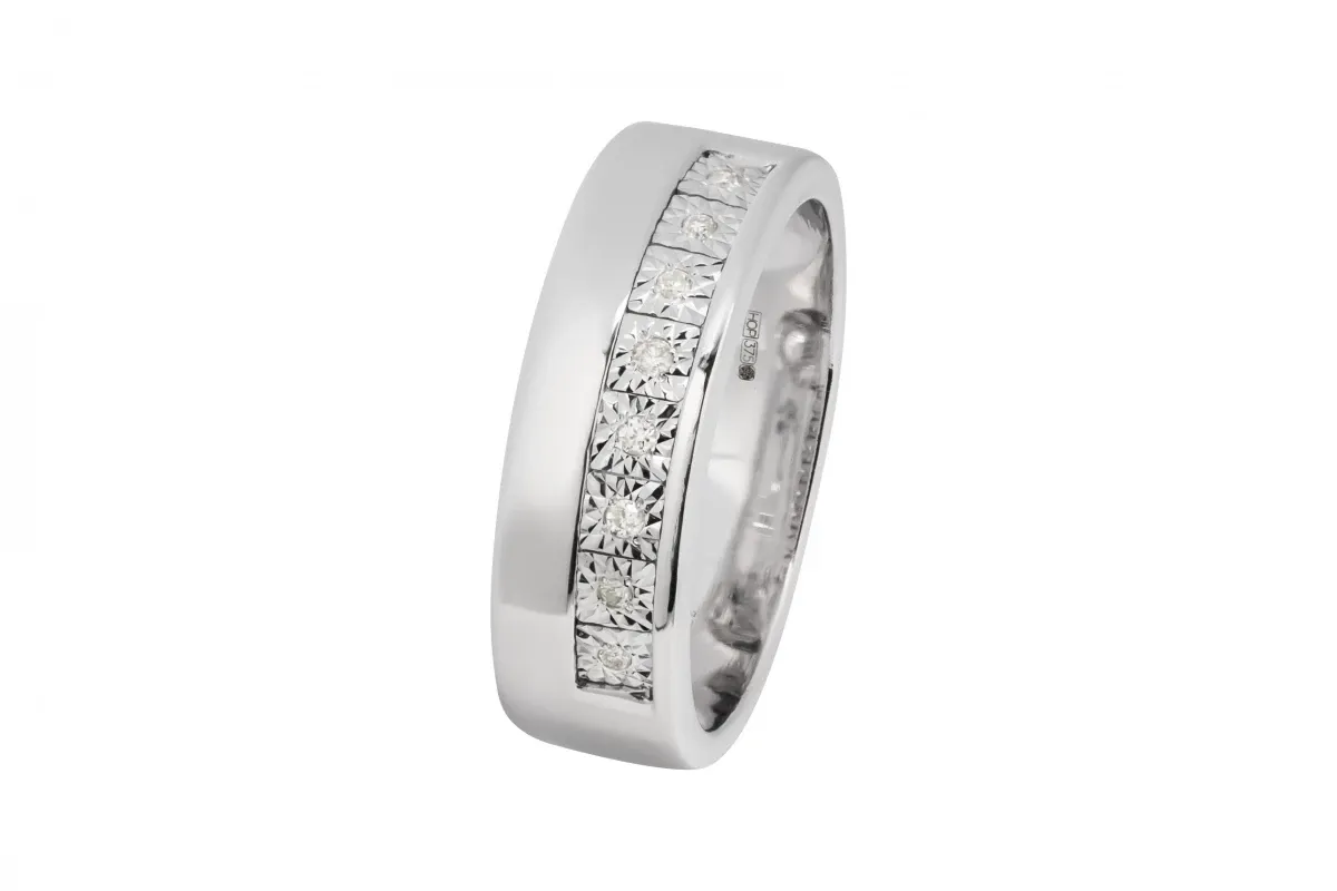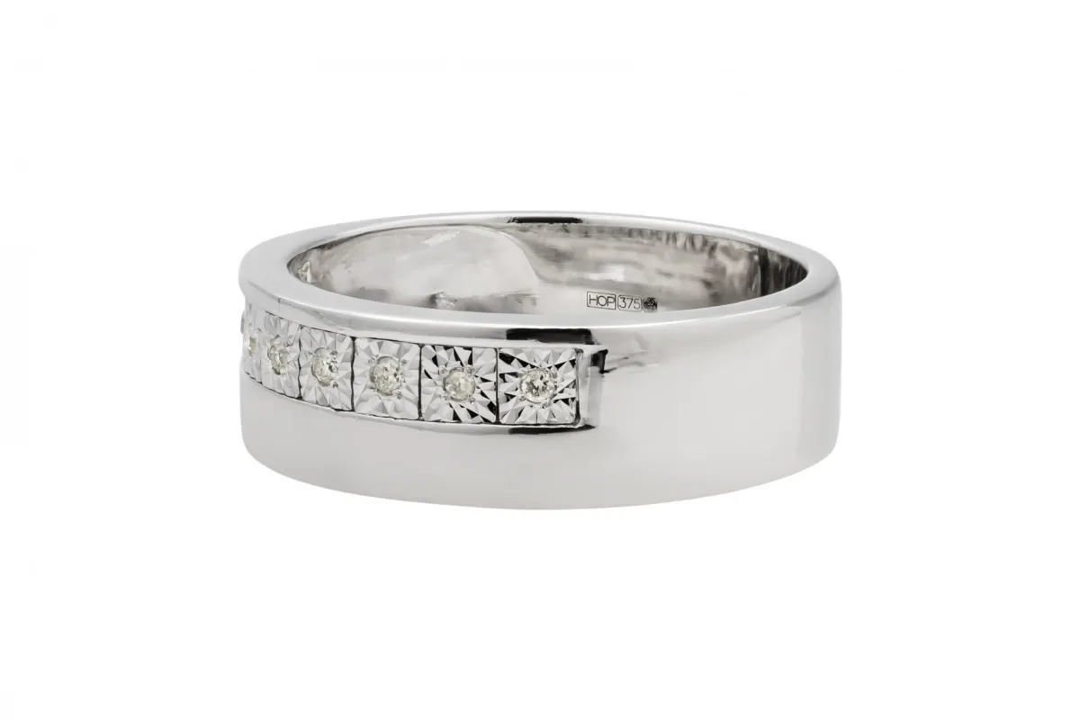 Crafted in elegant 9ct white gold, this wedding band features a subtle 0.05ct diamond set into a smooth 6.2mm band, offering just the right touch of sparkle.
