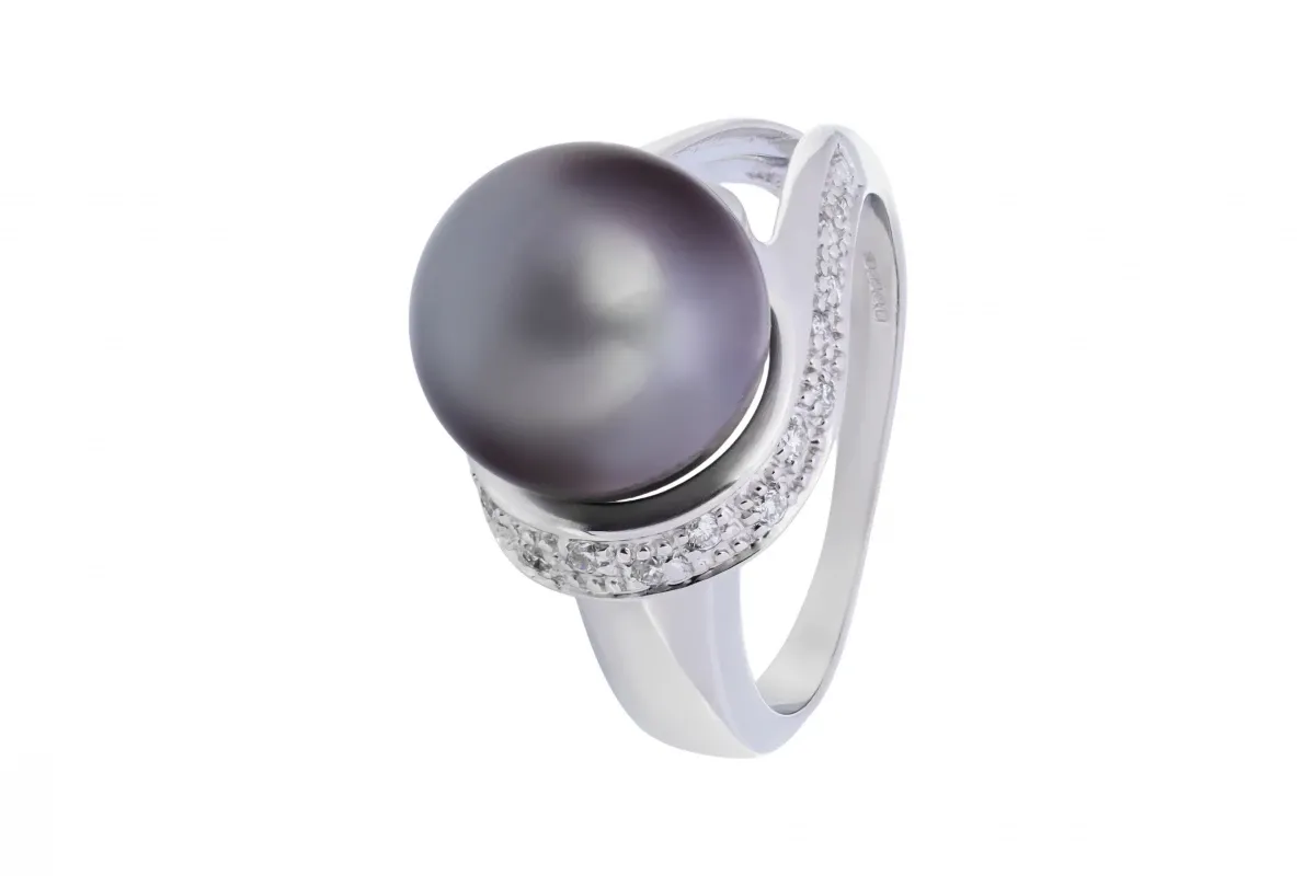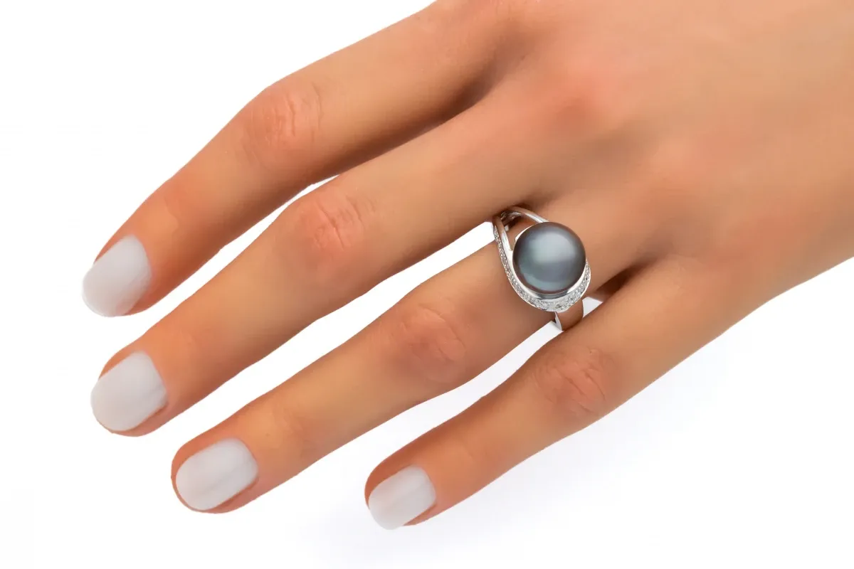 A timeless and sophisticated design, this 9ct white gold ring features a lustrous cultured Tahitian black pearl as its centrepiece, renowned for its deep, iridescent tones.