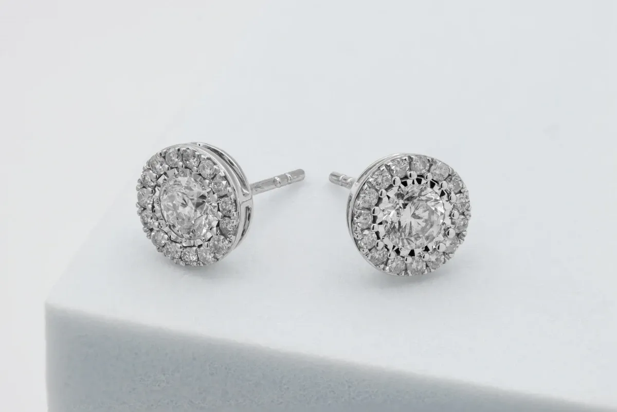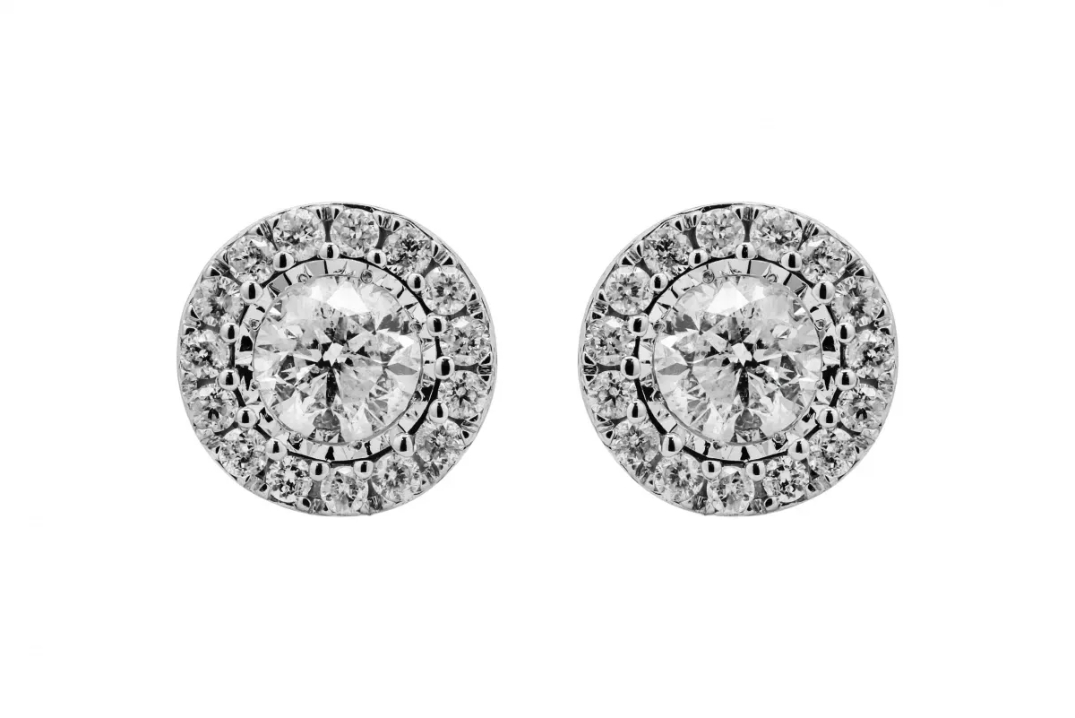 These stunning 9ct white gold halo stud earrings feature a total of 1.48 carats of diamonds, graded G for colour and VS for clarity.