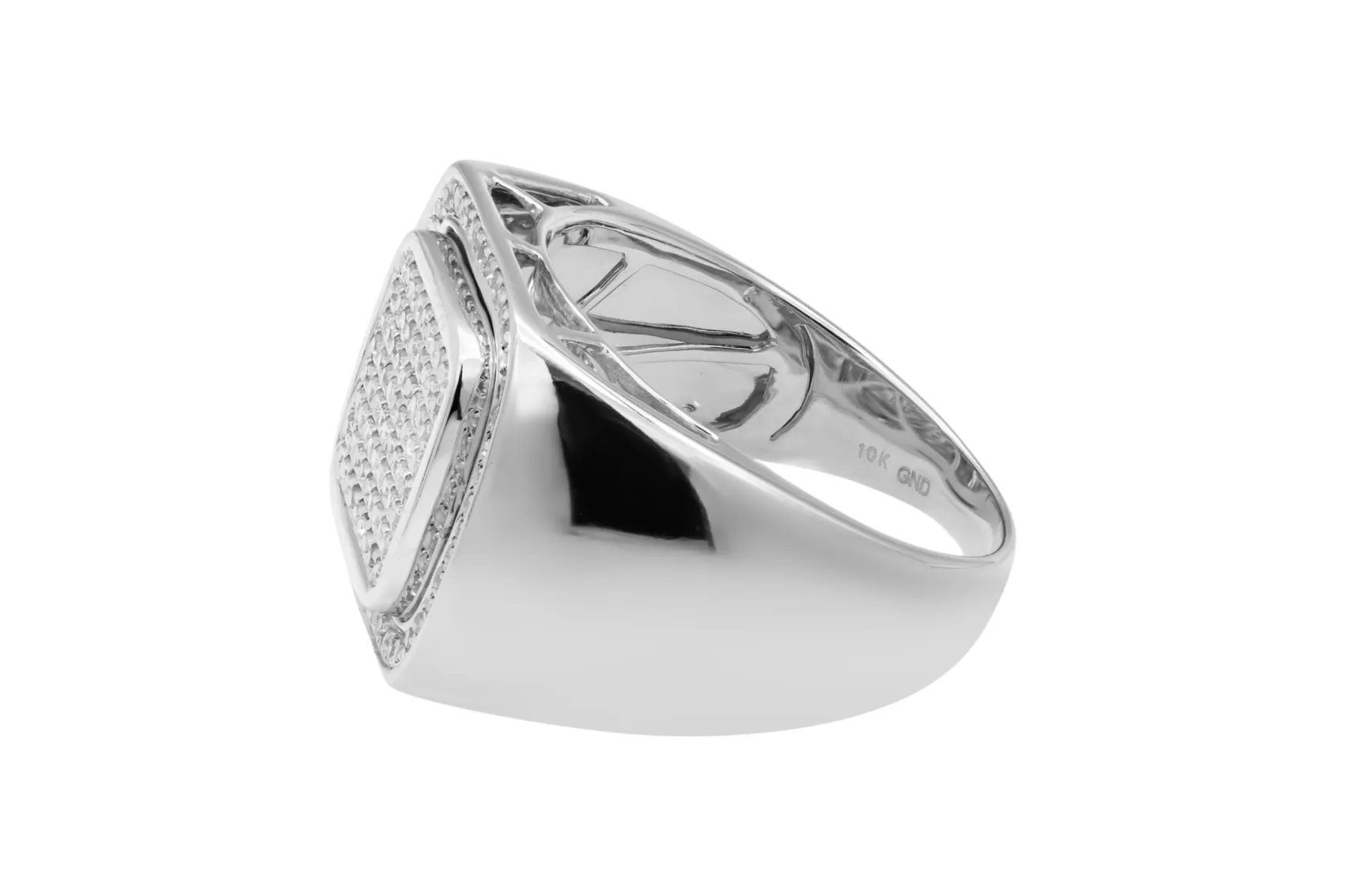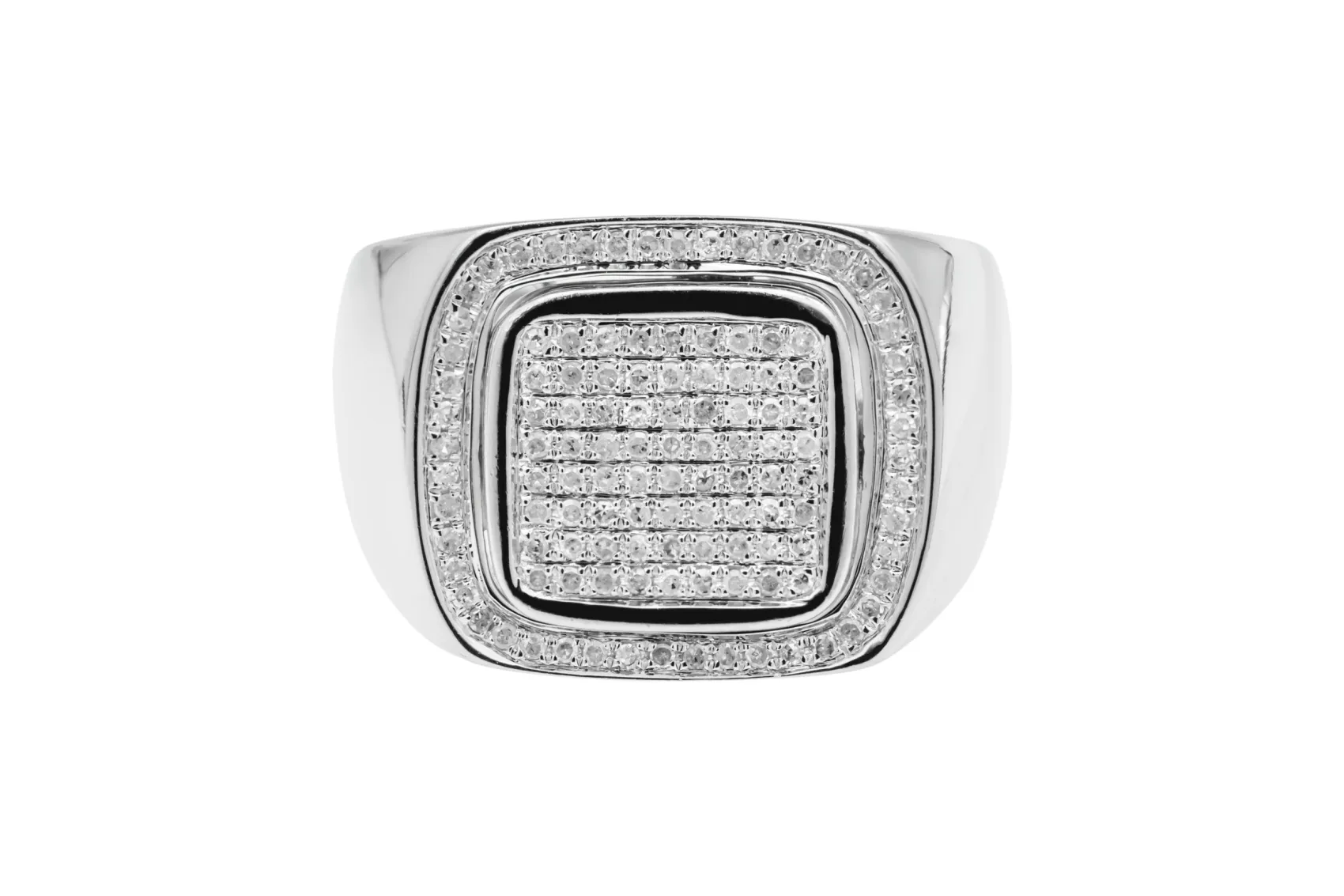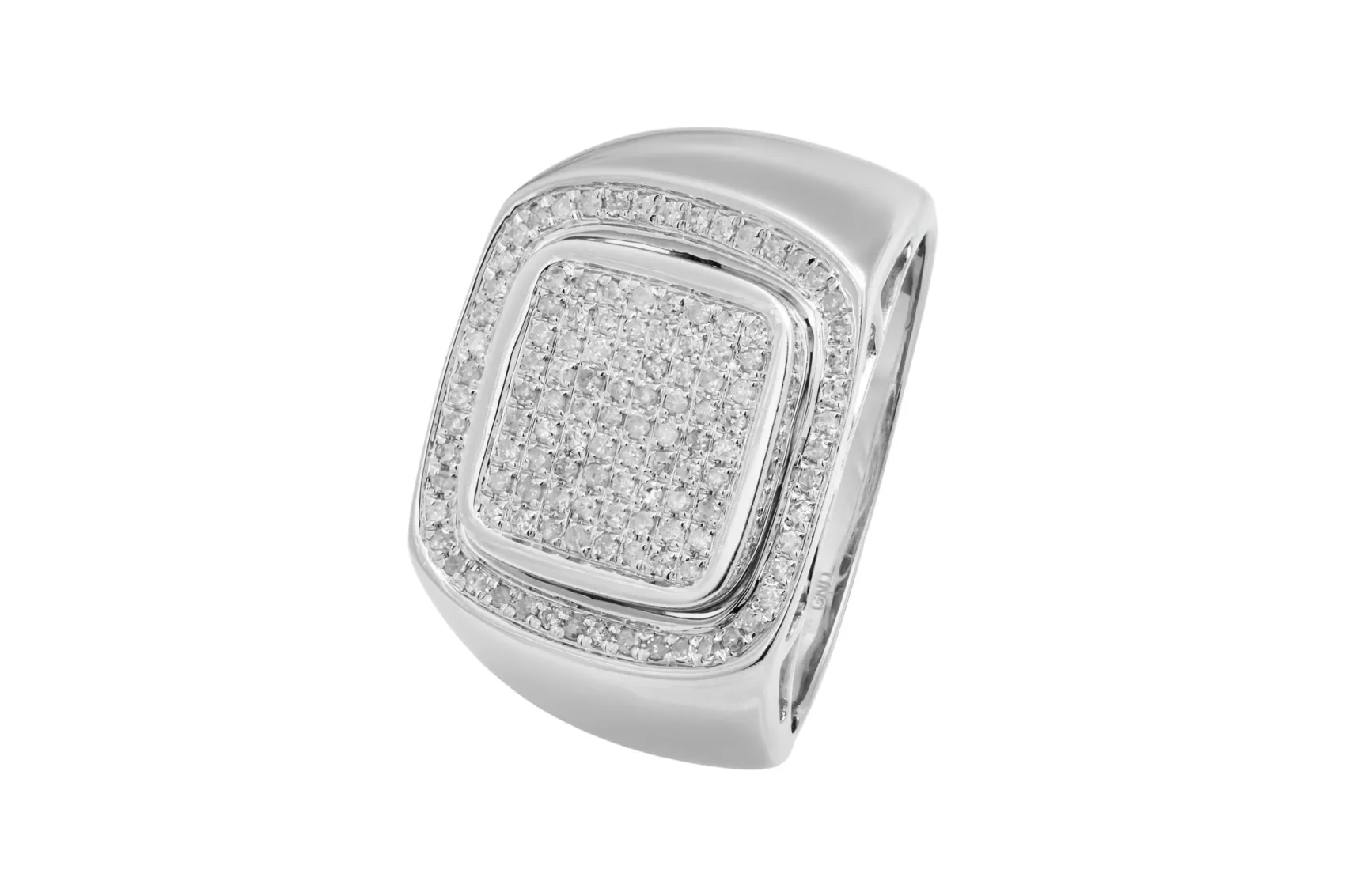 This bold 9ct white gold ring is set with 0.57ct of round brilliant cut diamonds, graded G colour with SI clarity for bright, balanced sparkle.