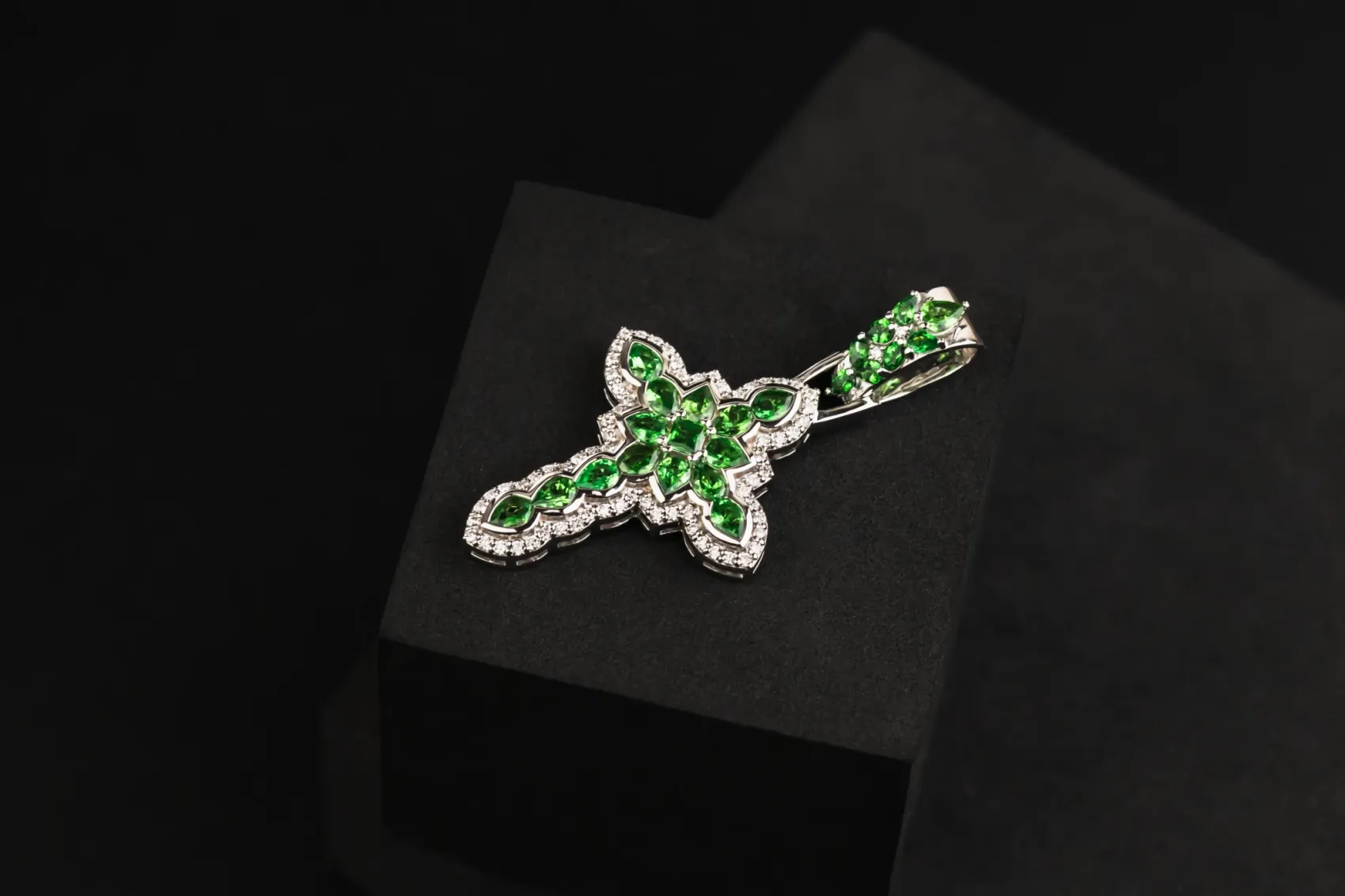 This striking 9ct white gold cross pendant is set with a vibrant 2.83ct of rich green tsavorite gemstones, beautifully accented by 0.71ct of brilliant cut diamonds.