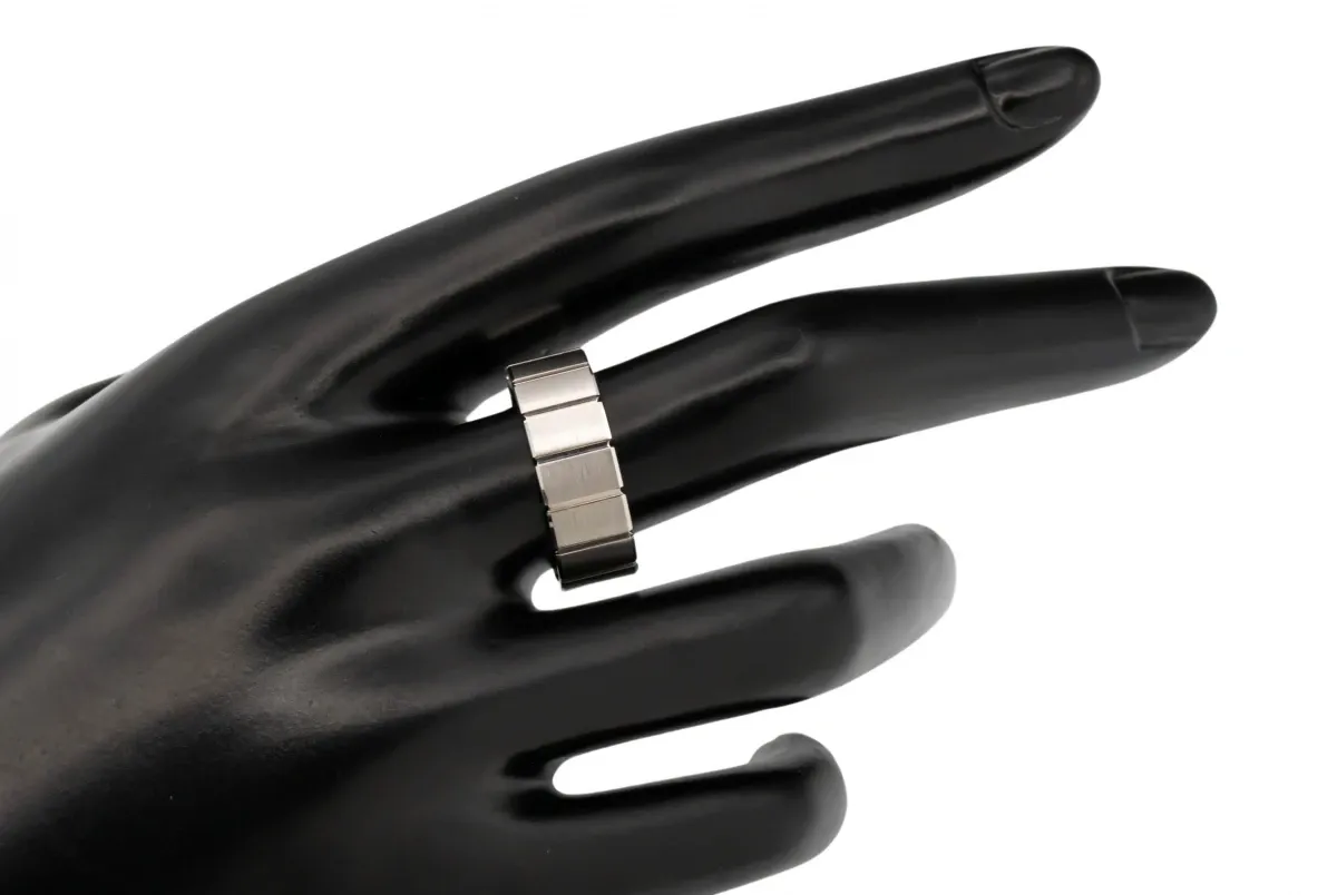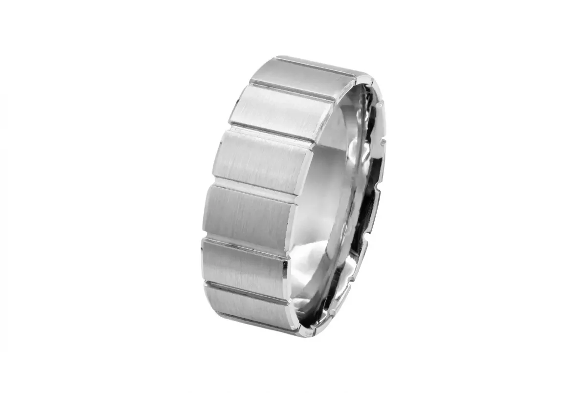 Featuring polished bands within a satin finish, the 7.6mm wide ring offers a contemporary yet timeless style.