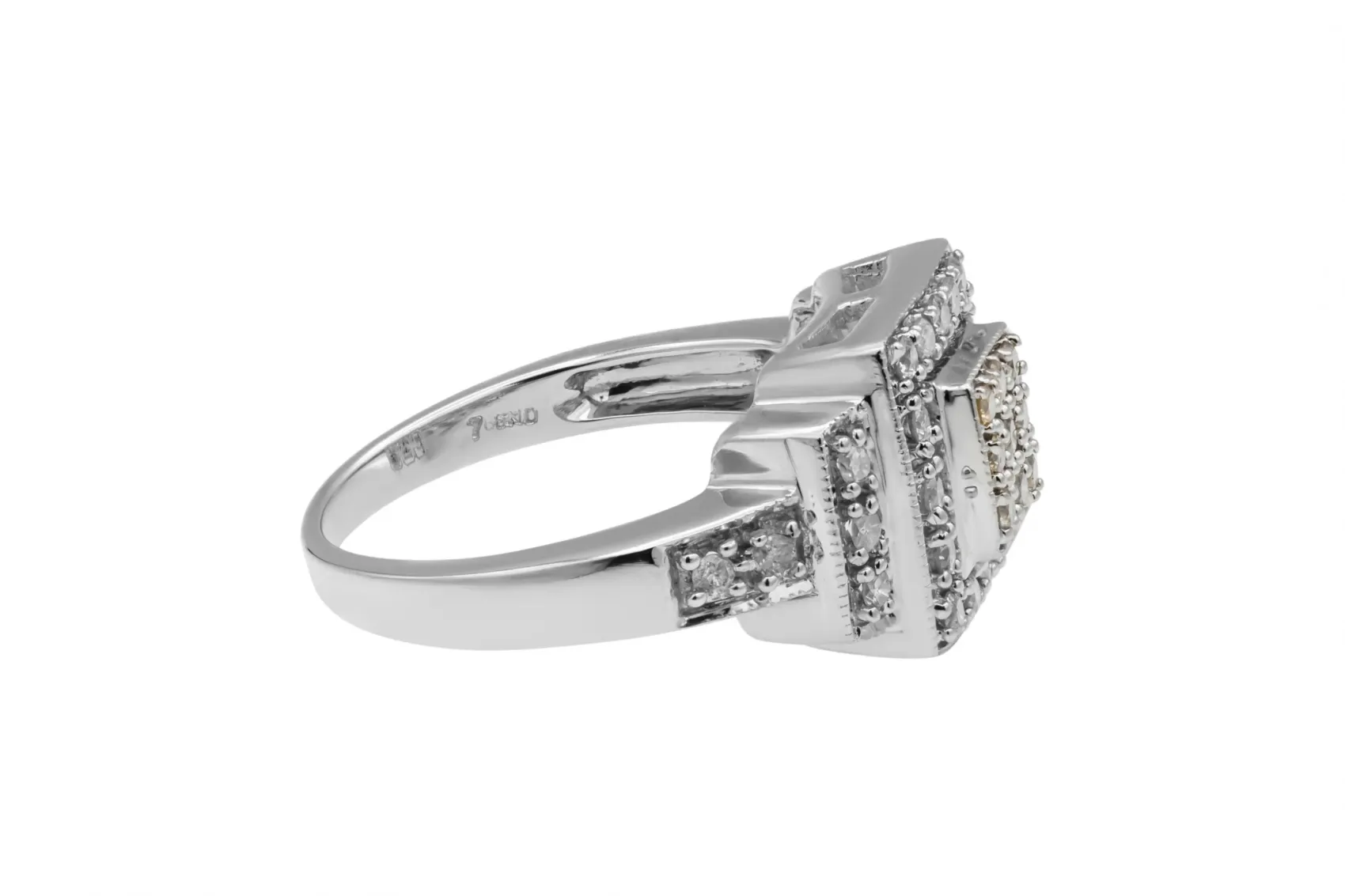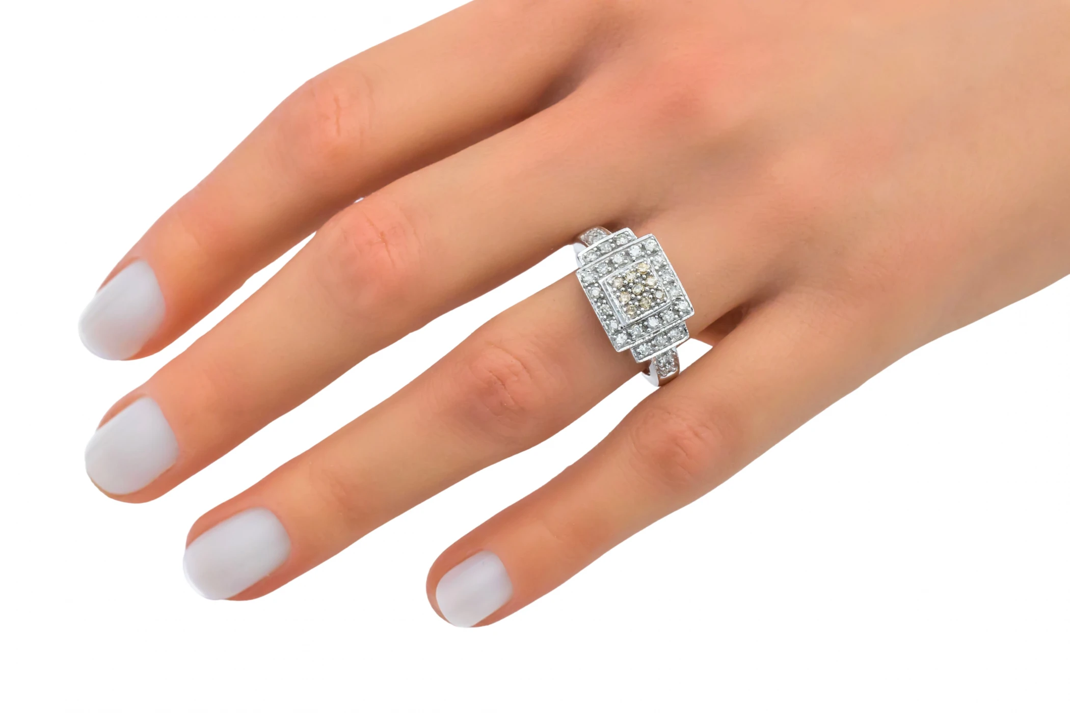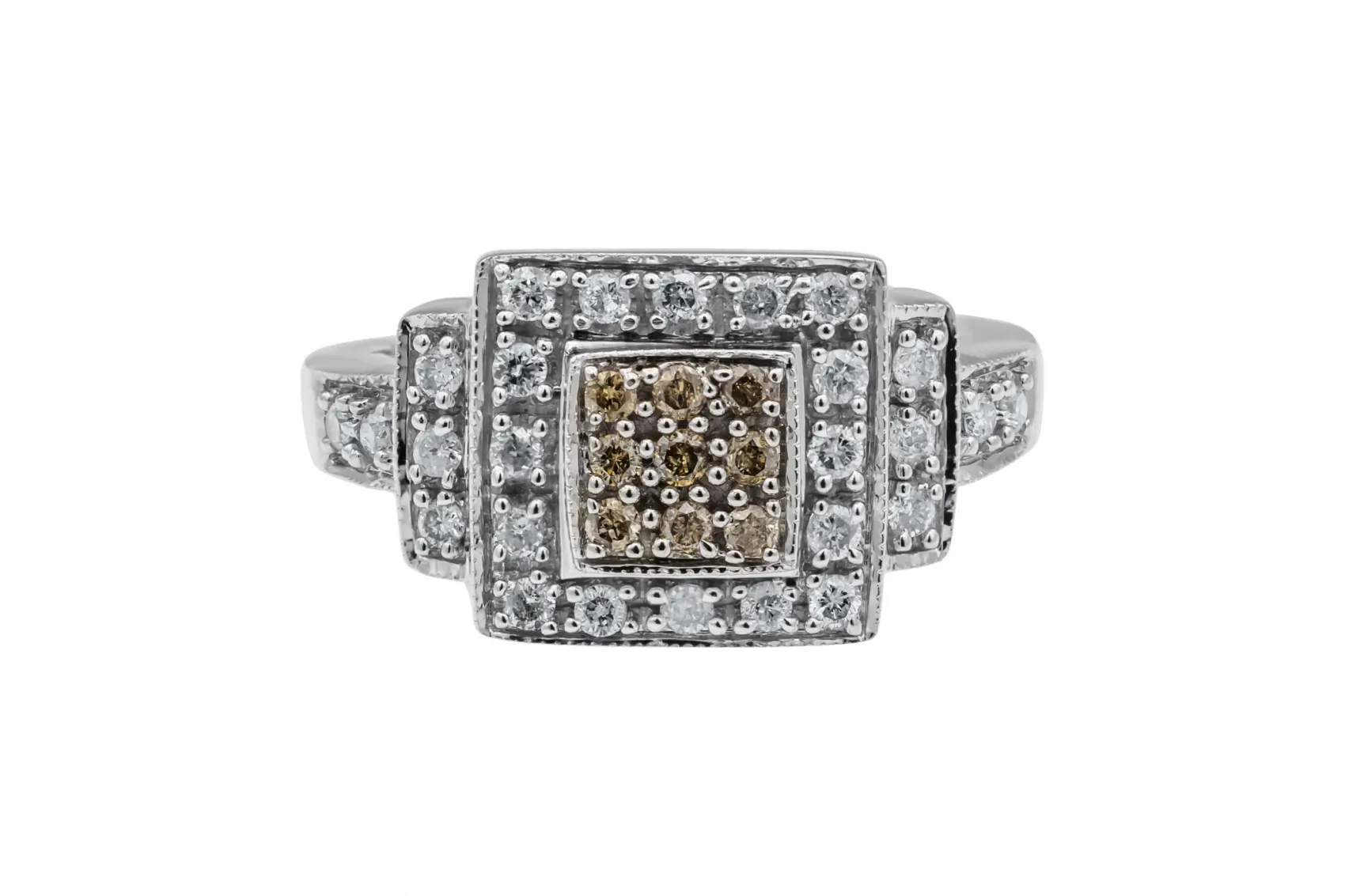 This distinctive 9ct white gold ring features a bold square design set with a striking combination of white and chocolate diamonds totalling 0.22ct. Graded I colour with SI clarity, the contrasting tones create a contemporary, eye-catching look while maintaining refined sophistication.