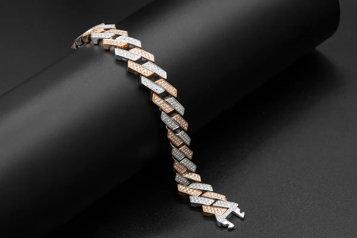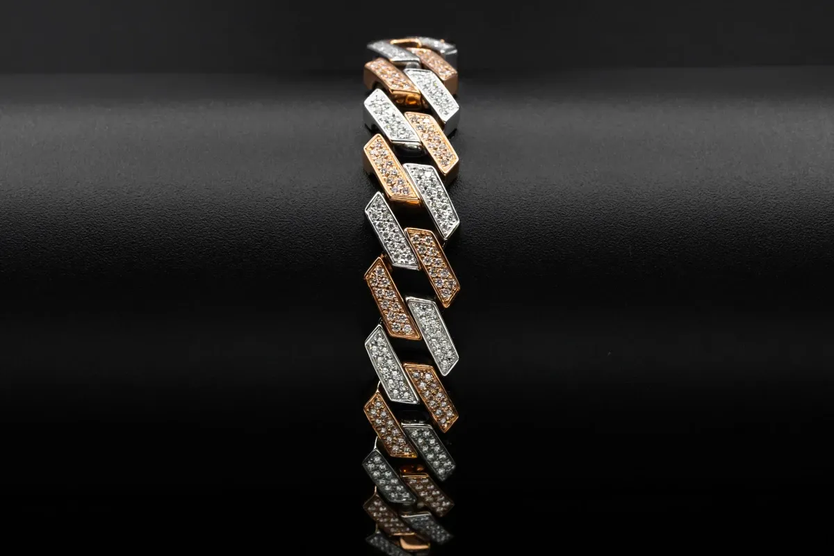 This dazzling 9ct white and rose gold prong style Cuban bracelet isset with 5.50ct of F-G Colour VS diamonds.