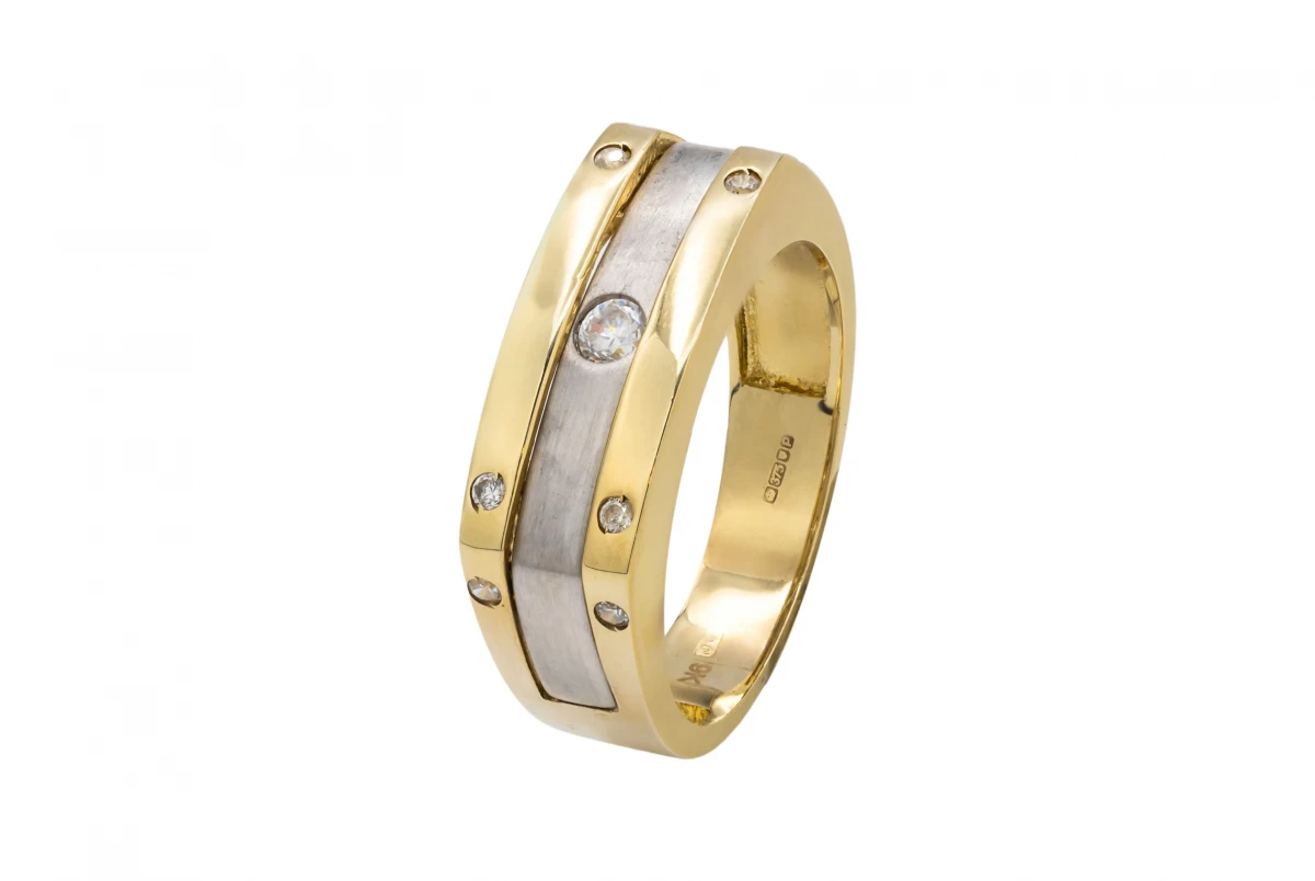 Crafted in 9ct yellow and white gold, this modern band ring features a sleek two-tone design that offers contrast and contemporary style.